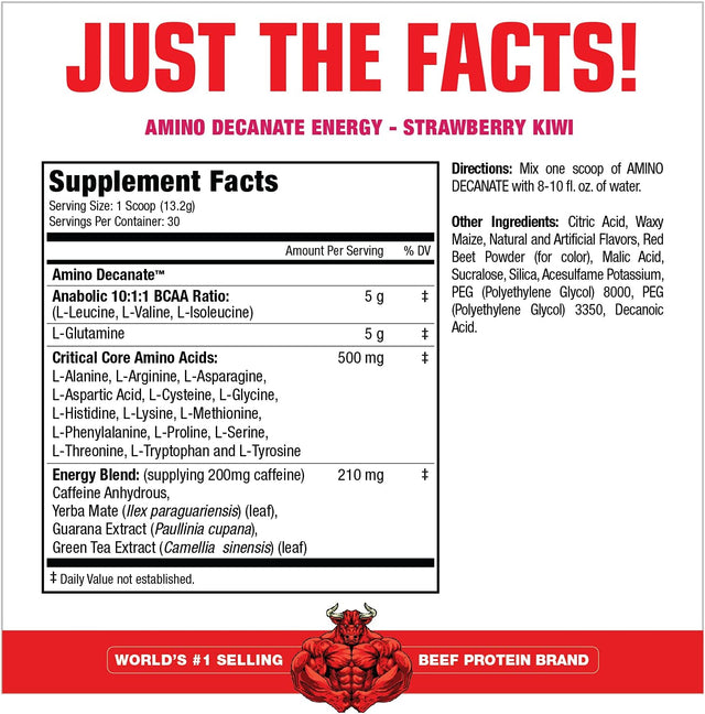AMINO DECANATE ENERGY - Research shows that while BCAAs and glutamine are the major players in muscle growth, 15 other amino acids known as Critical Core Amino Acids (CCAAs) also play a vital role. In fact once you deplete any of these aminos your muscle growth and performance can be compromised. This phenomenon is known as the “Rate Limiting Amino Acid Factor.” Each serving of AMINO DECANATE ENERGY provides 19 critical amino acids for peak muscle building, improving performance and speeding recovery, plus a 210mg energizing blend to boost energy, concentration, and performance. AMINO DECANATE ENERGY provides all of the anabolic micronized amino acids via the scientifically advanced DecaDrive Technology for faster and better absorption and utilization of these critical muscle building aminos. DecaDrive Technology employs a highly advanced delivery system that uses the compounds PEG and Decanate to increase amino acid uptake in the intestines. This powerful infusion helps deliver maximum anabolic muscle building, anti-catabolic muscle protection, increased energy production and improved recovery. AMINO DECANATE ENERGY is the new bodybuilding standard in amino acid supplementation!