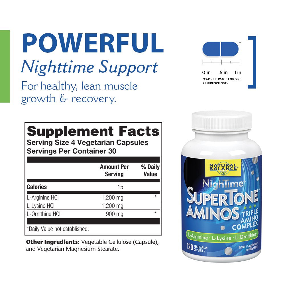Natural Balance NighTime SuperTone Aminos is made up of three vital amino acids, essential to protein synthesis and more: L-arginine supports the bodys natural production of nitric oxide, which helps enhance healthy blood flow, providing oxygen and nutrients to muscle fibers. L-lysine is central to the production of carnitine, a nutrient that helps burn fat for energy, while L-ornithine helps support a healthy sleep cycle, essential to muscle recovery and strength.