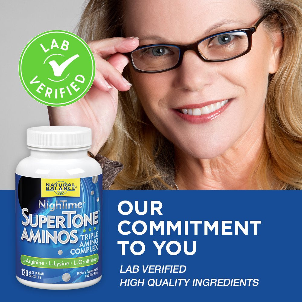 Like all Natural Balance products, NighTime SuperTone Aminos is lab verified for purity, potency and identity. To ensure you get only the best supplement with the best ingredients, our products undergo a rigorous screening and testing protocol for raw materials and finished goods. So go ahead and rest easy, knowing each bottle of NighTimeSuper Tone Aminos meets its label claims.