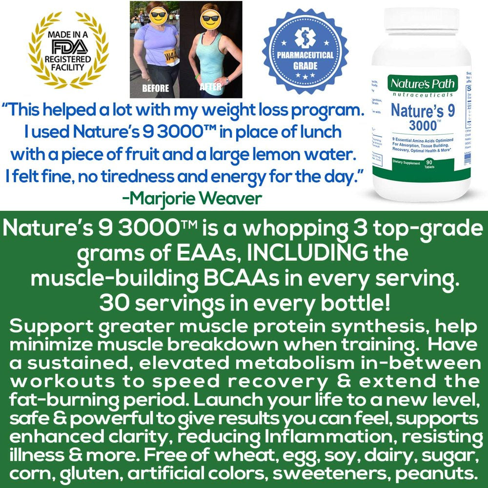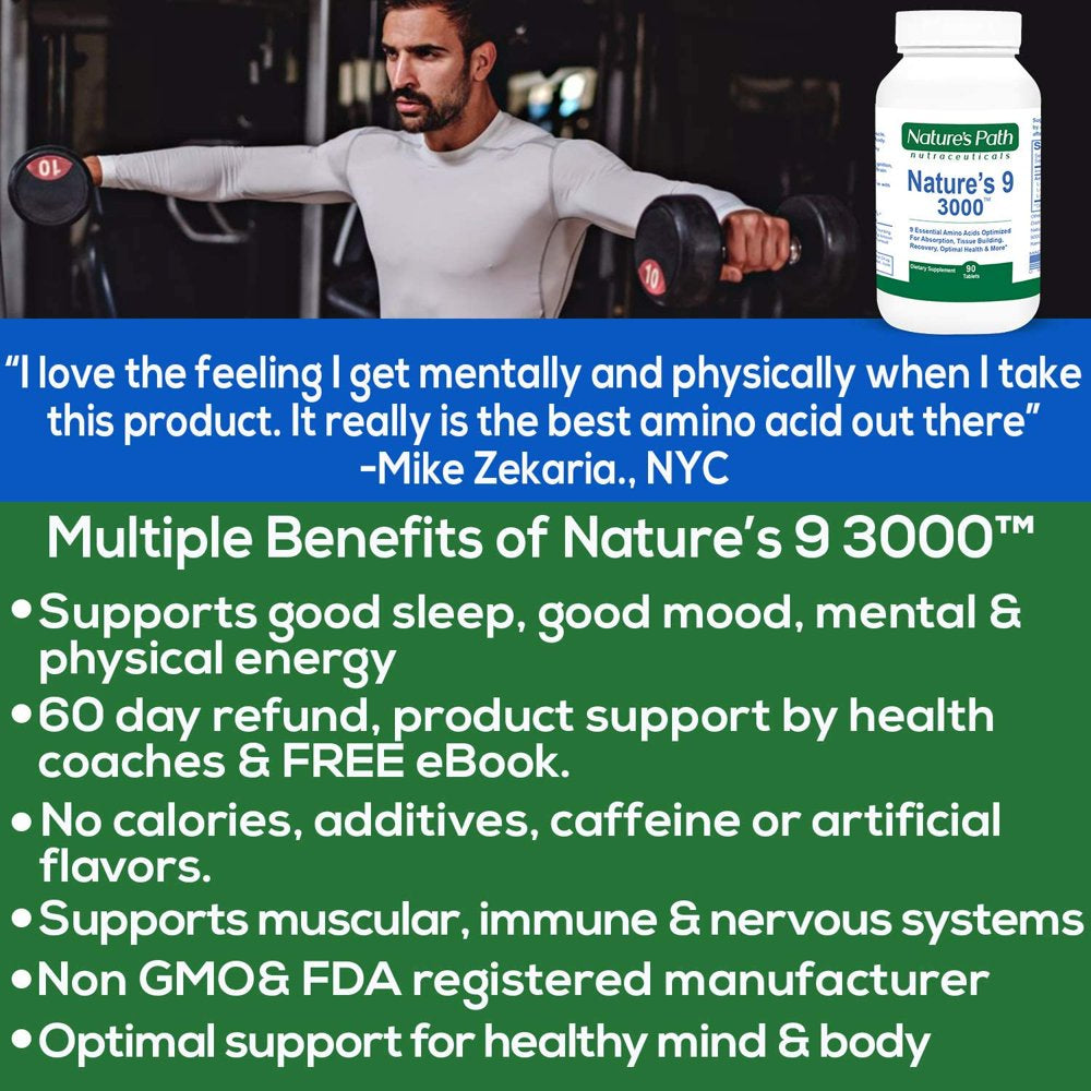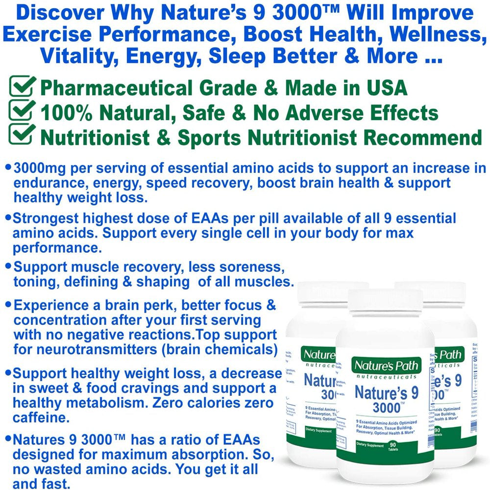 Nature’s Path Nutraceuticals is one of the leading essential amino acid supplement providers on the market & now brings you Nature’s 9 3000, an amino acid pill with 1000mg of EAAs per tablet. 3 pills once to twice per day for maximum potency. Great for women who want lean muscles with no bulk, and great for men to get that extra complete amino acid tablet boost. Our amino acid products are science based so you can feel & measure the difference.