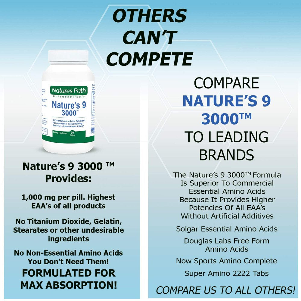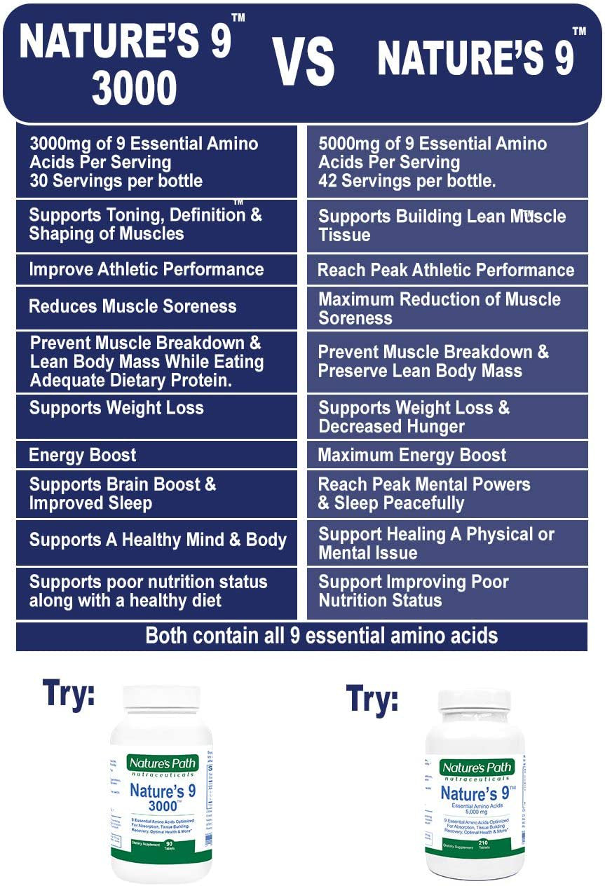 - MOST POTENT To equal our EAA easy to swallow tablet potency, you'd need to take about 7-10 essential amino acid pills a day of other brands, with ours you only need 3. Experience all natural mental & physical gains. Build lean muscle not bulk. Supports active lifestyles or to support recovery from injury or illness. Natures 9 3000 is for you! Created by essential amino acid, bcaa and amino acid world experts.