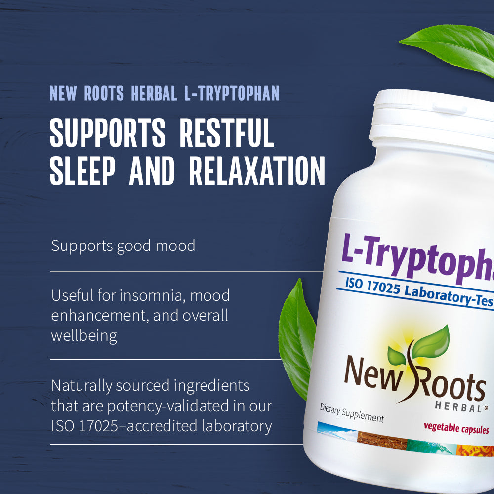 - SUPPORTS RELAXATION - New Roots Herbal’s L Tryptophan is an excellent choice to supplement levels of the critical amino acid that deplete as we age and can prove useful for insomnia, mood enhancement, and overall wellbeing.