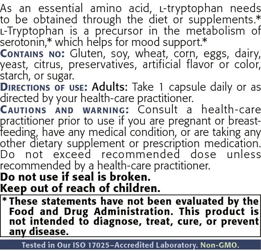 As an essential amino acid, l?tryptophan needs to be obtained through the diet or supplements.* l?Tryptophan is a precursor in the metabolism of serotonin, which helps for mood support.* Contains no: Gluten, soy, wheat, corn, eggs, dairy, yeast, citrus, preservatives, artificial flavor or color, starch, or sugar. Directions of use: Adults: Take 1 capsule daily or as