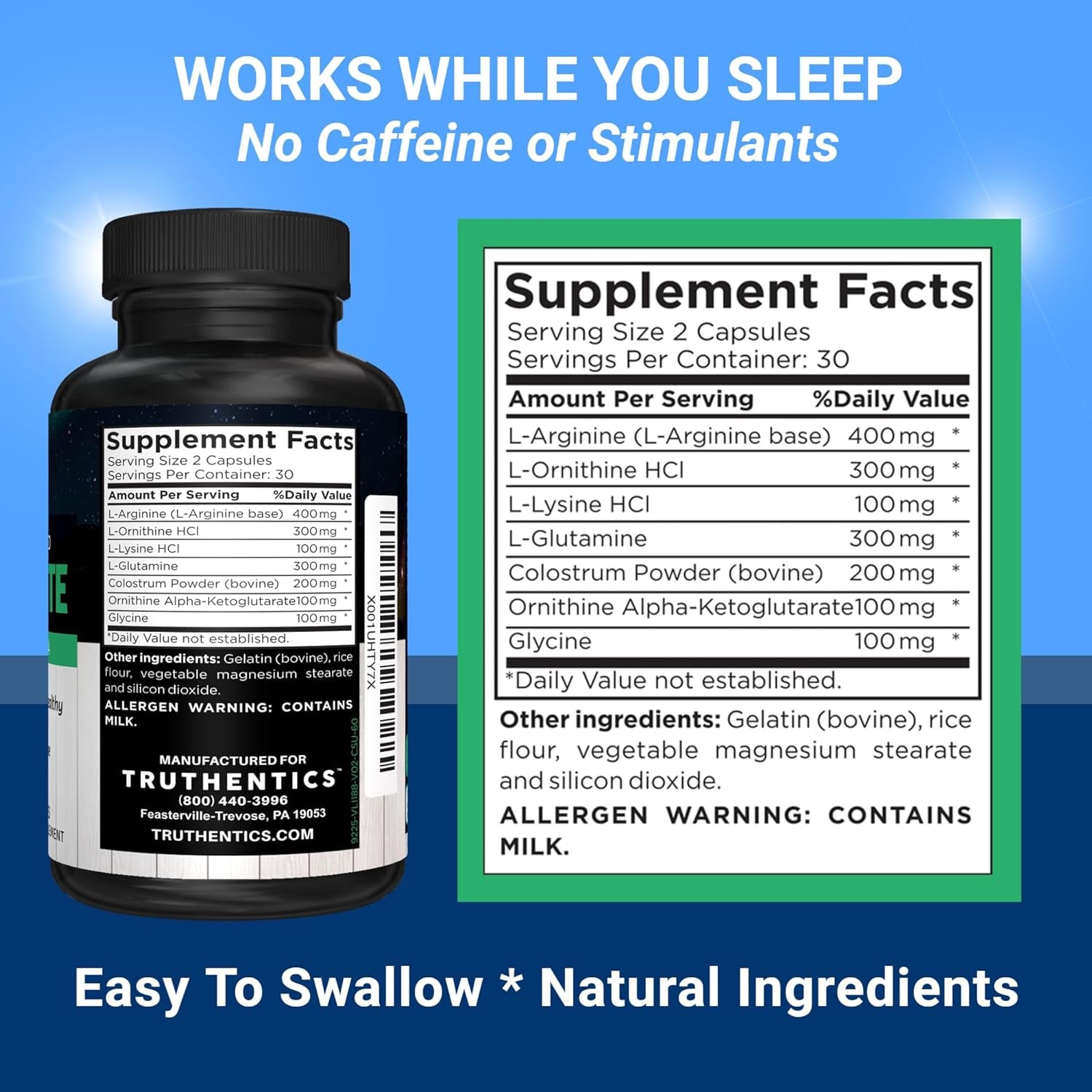 MADE WITH AMINO ACIDS & VITAL NUTRIENTS. Truthentics Metabolism NITE is formulated with a superb blend of 7 essential amino acids and nutrients to support a healthy metabolism. These include L-Arginine, L-Glutamine, L-Ornithine HCI, L-Lysine HCI, L-Glycine, Ornithine Alpha-Ketoglutarate, and Colostrum Powder.