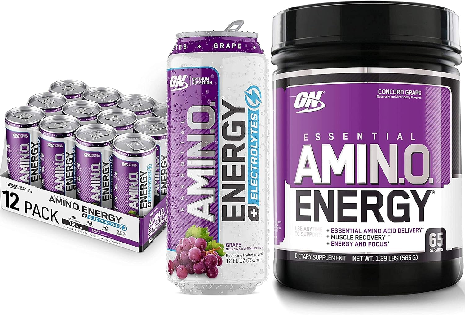Optimum Nutrition Amino Energy Powder: Concord Grape (65 Servings) with Essential Amino Energy plus Electrolyes Sparkling Drink: Grape (12 Cans) - Bundle Pack is backordered and will ship as soon as it is back in stock.