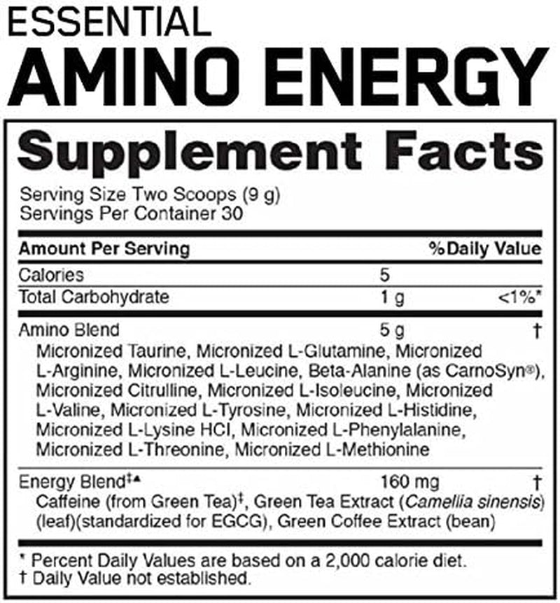 Mix up ESSENTIAL AMIN.O. ENERGY anytime you want a fruit flavored or coffeehouse inspired boost of energy and alertness. You can determine what's appropriate for any situation, adding a 2-scoop serving to water for an afternoon pick-me-up or increasing the amino acid matrix to 10 grams with a 4-scoop pre-workout drink that delivers 200 mg of caffeine from green coffee and green tea extracts.