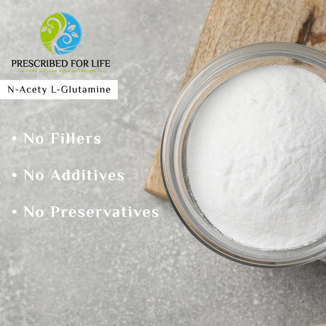 - PURE L GLUTAMINE POWDER : Prescribed for Life N Acetyl L Glutamine Powder provides a powerful dose of 100% pure L-Glutamine with no fillers, preservatives, or additives. N Acetyl L-Glutamine is a water soluble and the preferred form of L Glutamine powder to use in preworkout drinks and smoothies.