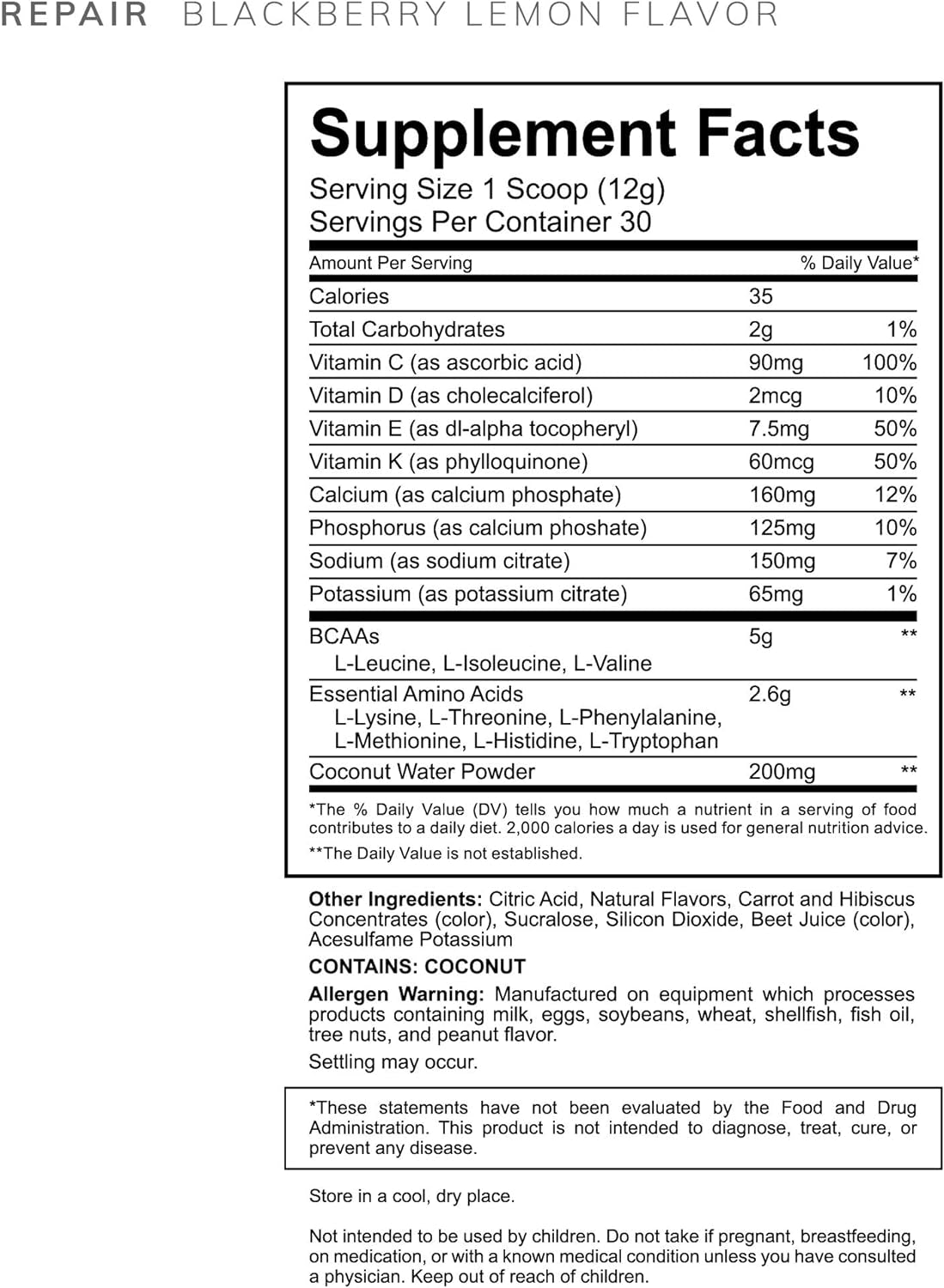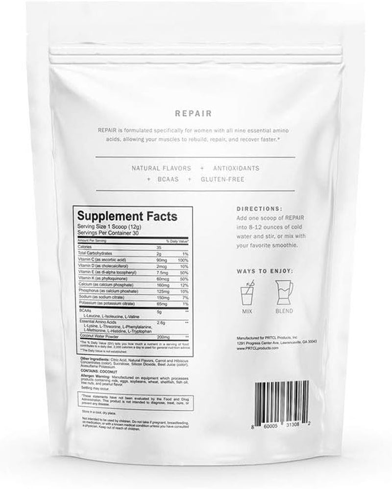 BCAA + EAA, Plus VitaminsWith only 35 calories, PRTCL REPAIR is a low calorie, sugar-free drink mix that delivers 5g BCAAs; 2.6G Vegan-Sourced Essential Amino Acids; 12 Vitamins and Minerals - plus 200mg Coconut Water powder to aid with rapid hydration and muscle recovery, post-workout. It's also available in two delicious flavors! | Made in the USA (By Women)Our ingredients are domestically-sourced and listed on the label, with no hidden additives, proprietary blends or formulas. PRTCL was conceived by a team comprised of 90% women, led by scientists, nutritionists, and athletes to produce innovative supplements uniquely formulated for women's health and nutrition. | Informed Sports Global CertificationPRTCL Products are manufactured in cGMP Facilities and are Informed-Sports Certified. Every batch of PRTCL Supplements undergoes extensive analysis to ensure the quality, purity, and label accuracy of what's inside – so it meets the stringent demands of today's top athletes...and you. |