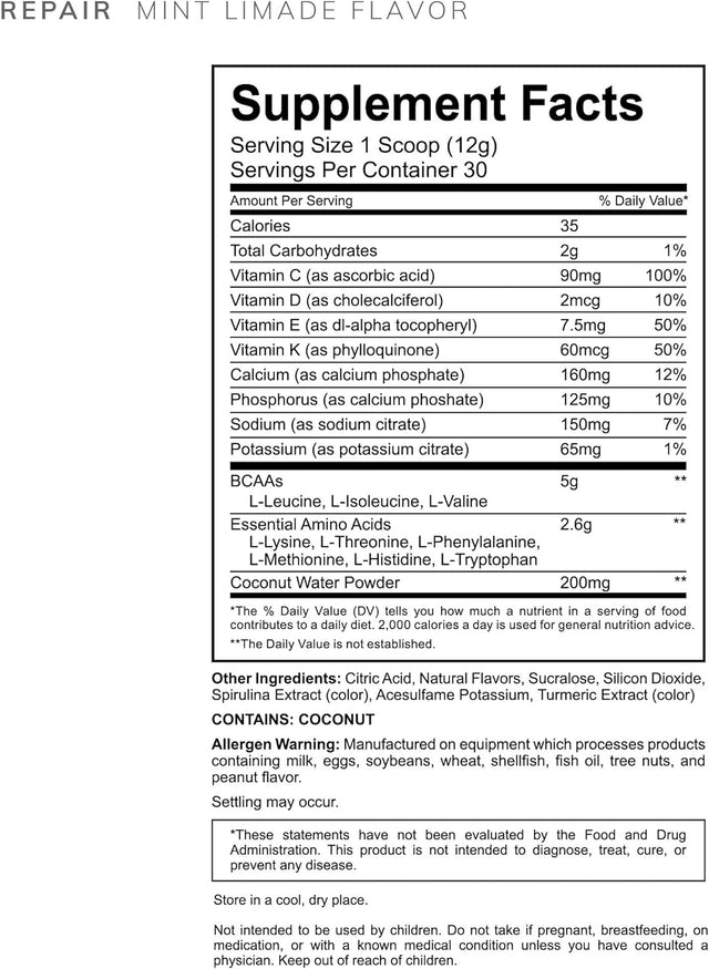 BCAA + EAA, Plus VitaminsWith only 35 calories, PRTCL REPAIR is a low calorie, sugar-free drink mix that delivers 5g BCAAs; 2.6G Vegan-Sourced Essential Amino Acids; 12 Vitamins and Minerals - plus 200mg Coconut Water powder to aid with rapid hydration and muscle recovery, post-workout. It's also available in two delicious flavors! | Made in the USA (By Women)Our ingredients are domestically-sourced and listed on the label, with no hidden additives, proprietary blends or formulas. PRTCL was conceived by a team comprised of 90% women, led by scientists, nutritionists, and athletes to produce innovative supplements uniquely formulated for women's health and nutrition. | Informed Sports Global CertificationPRTCL Products are manufactured in cGMP Facilities and are Informed-Sports Certified. Every batch of PRTCL Supplements undergoes extensive analysis to ensure the quality, purity, and label accuracy of what's inside – so it meets the stringent demands of today's top athletes...and you. |