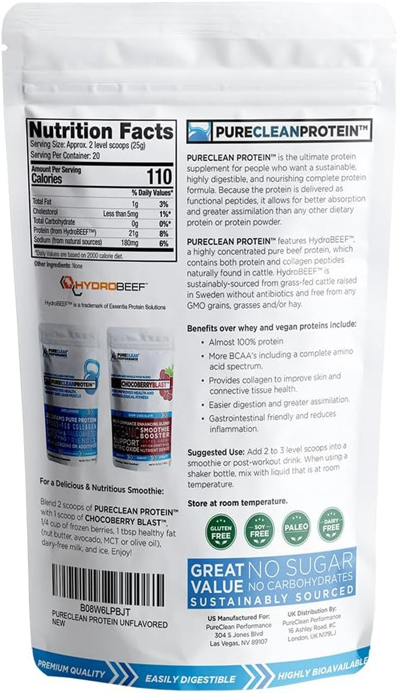 PURECLEAN PROTEIN contains 100% HYDROBEEF protein and is low carb which makes it ideal for those on a Keto, Paleo diet or anyone who wants the unique grass fed beef protein profile that comes only from natural organic beef high protein. Its protein source, HydroBEEF, contains critical nutrients that are naturally found in beef, including a significant amount of collagen-specific amino acids, along with various minerals and vitamins such as the fat-soluble vitamins A and D, as well as natural forms of the B vitamins. It has an impressive protein nitrogen score of 101.5, which indicates high protein usability. Contains all 8 amino acids, 3 BCAAs to build muscle, help cravings for food and sugar free to fit into your paleo and keto diet, and to make a delicious smoothie. A perfect paleo pre workout preparation and post workout recovery free of all fillers, sugar, carbs, and preservatives and hormone free. 100% Natural and Organic.
