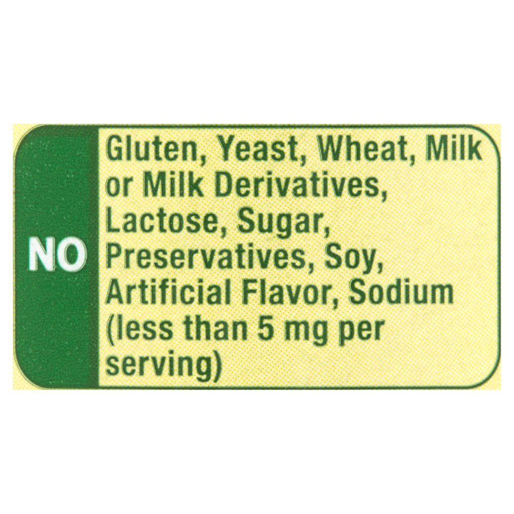 • No gluten, yeast, wheat, milk or milk derivatives, lactose, sugar, or soy