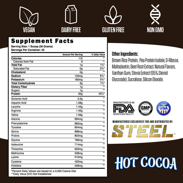Steel Supplements Veg-Pro | Vegan Protein Powder, Hot Cocoa | 25 Servings (1.65Lbs) | Organic Protein Powder with BCAA Amino Acid | Gluten Free | Non Dairy | Low Carb Formula
