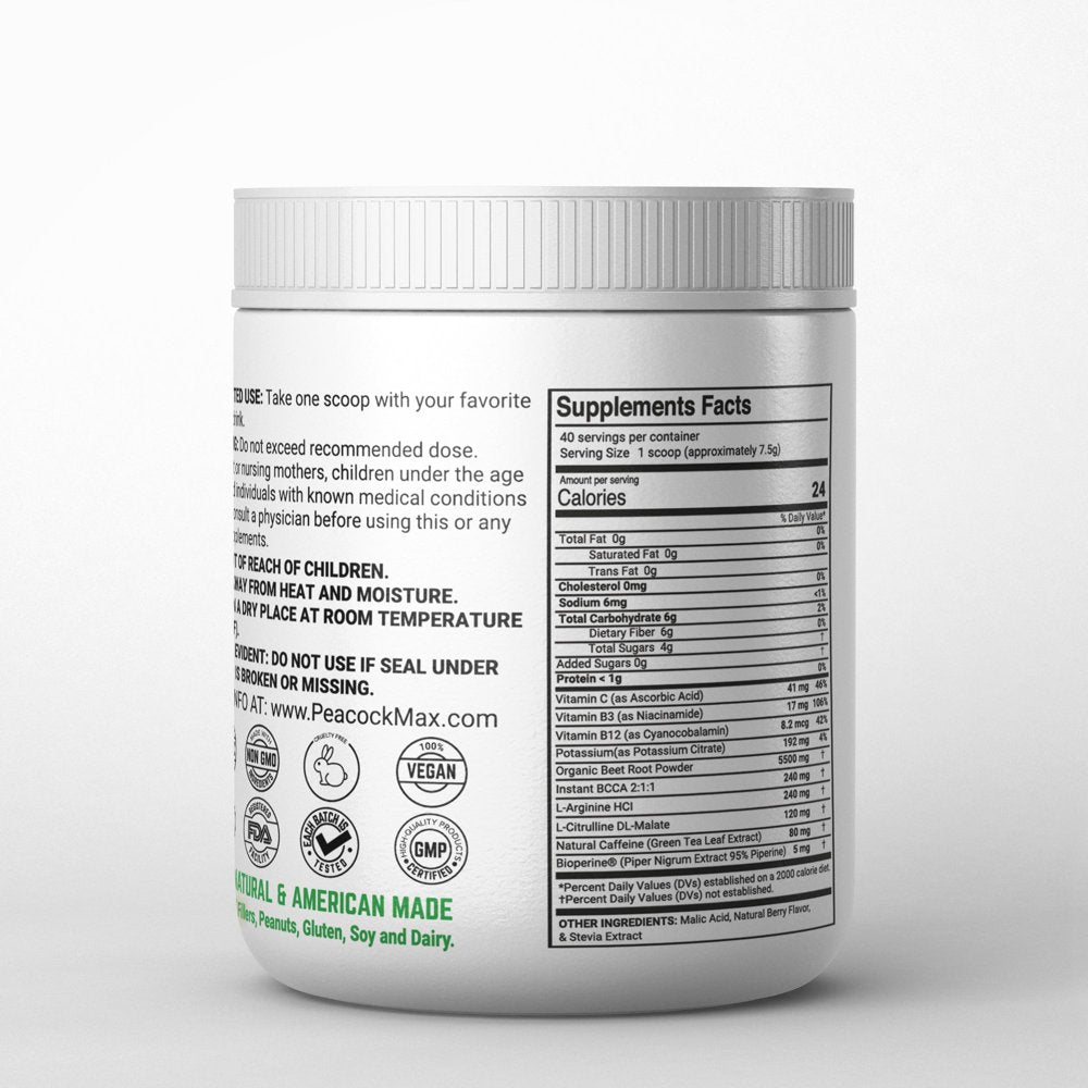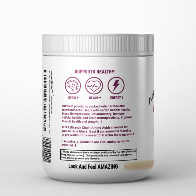 Our beet formula supports heart, cardiovascular system, blood pressure, and natural energy. 40 day supply of our organic beet root (5500mg) supplement contains Nitric oxide, Vitamin B12 (8.2mcg 42%), B3 (17mg 106%), Antioxidant C (41mg 46%), BCCA 2:1:1 (240mg), L-arginine HCI (240mg), L-citrulline D