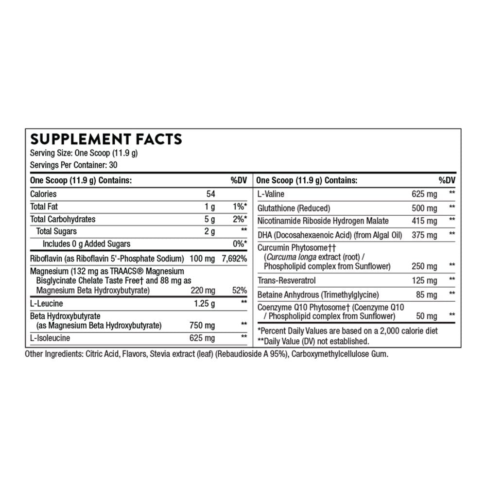 - Synergistic ingredients: Beta-hydroxybutyrate (BHB), branched-chain amino acids, DHA, Coenzyme Q10, NR, and other key nutrients for promoting brain health, cognitive function, and cellular energy production*