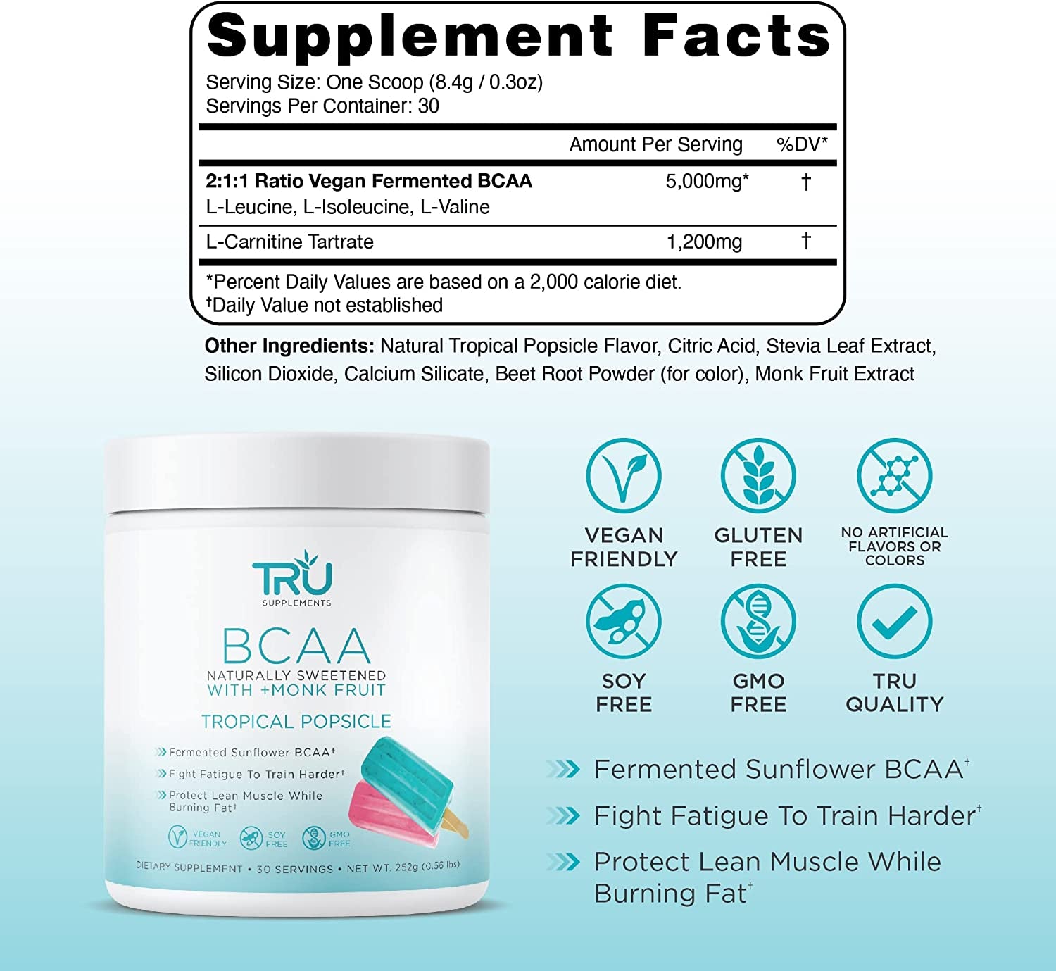 TRU BCAA, Plant Based Branched Chain Amino Acids, Vegan Friendly, Zero Calories, No Artificials Sweeteners or Dyes, 30 Servings, Tropical Popsicle