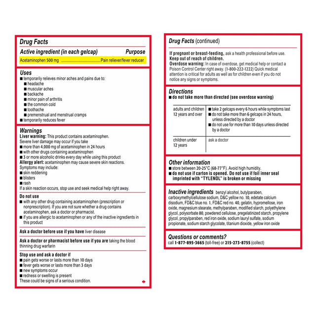 - Extra strength pain relief formula with 500 mg of acetaminophen contained in each gelcap