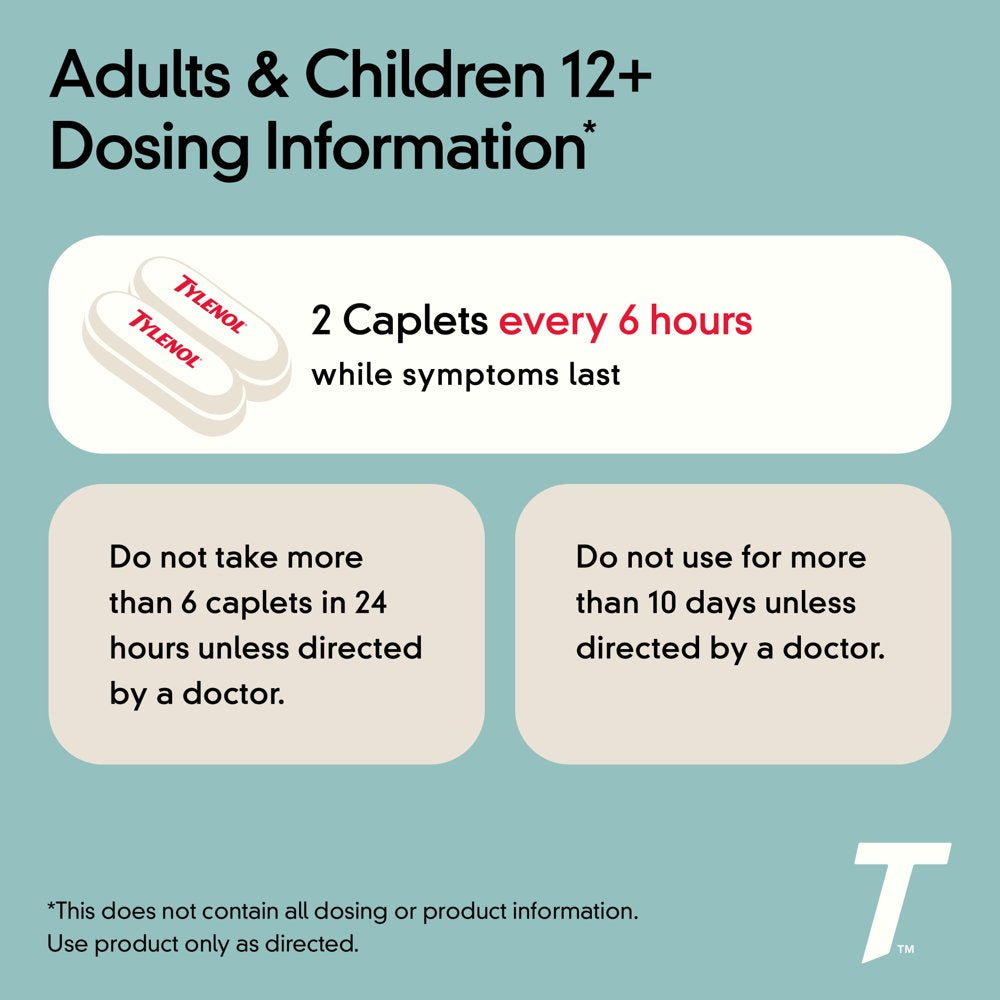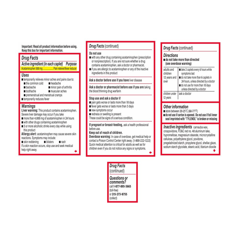 Tylenol Extra Strength caplets with 500mg of acetaminophen reduce fever and provide temporary relief of minor aches and pains. From the #1 doctor-recommended brand of pain reliever, each caplet contains 500 mg of acetaminophen for effective, extra strength pain relief. Both a fever reducer and pain reliever, it relieves minor aches and pains due to headache, backache, toothache, minor pain of arthritis, the common cold, and premenstrual and menstrual cramps. When used as directed, this extra strength oral pain reliever has an excellent safety profile and can be used by adults and children 12 years and older. To use, adults and children 12 years and over, take two caplets every 6 hours while symptoms last and do not take more than six caplets in 24 hours. From Tylenol, the #1 doctor recommended brand for pain relief and fever reduction.