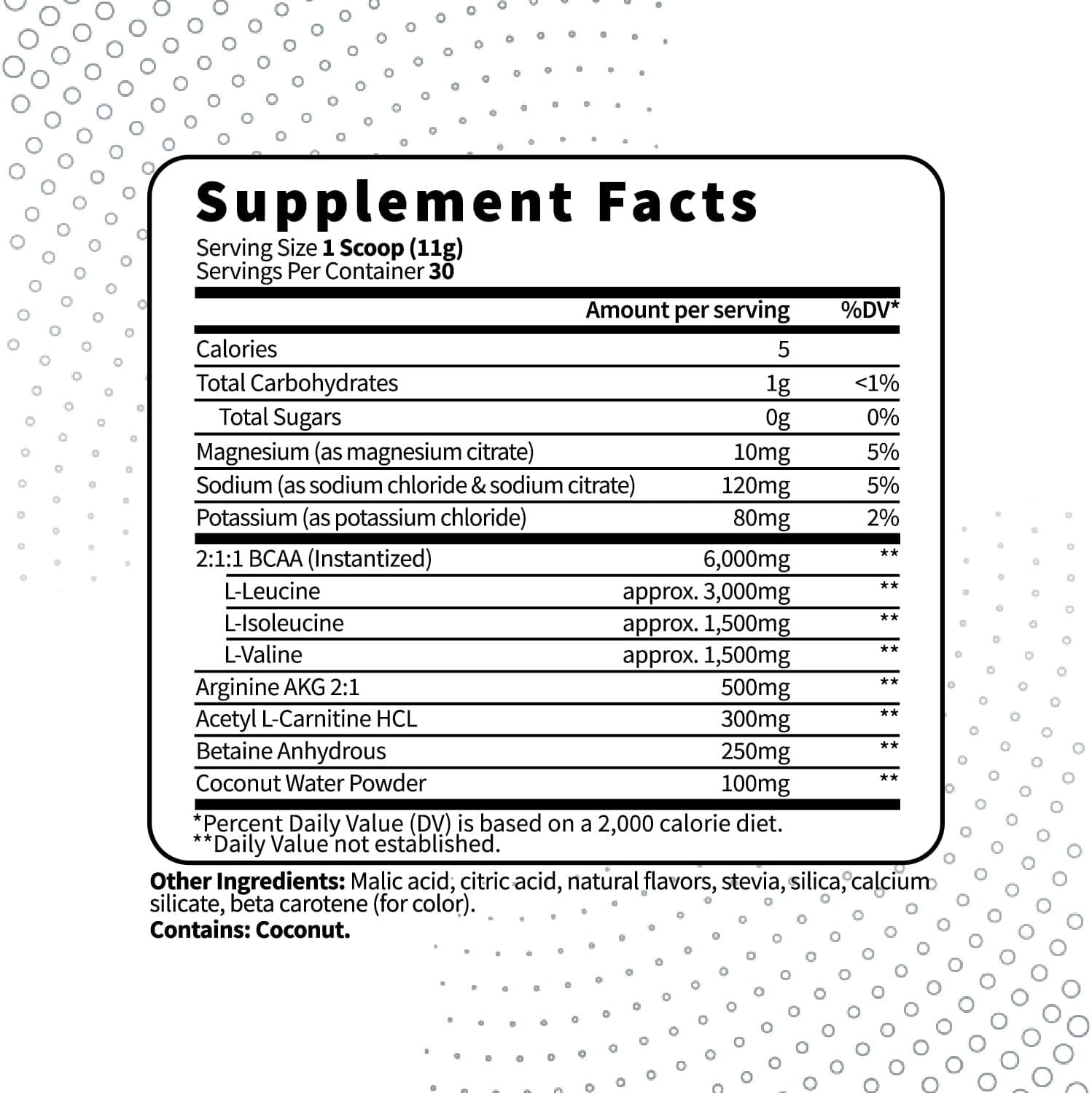 ๐ฎ:๐ญ:๐ญ ๐ฅ๐ฎ๐๐ถ๐ผ๏ผ๐ ๐ฎ๐ ๐ถ๐บ๐๐บ ๐ฅ๐ฒ๐๐๐น๐๐Formulated with 6 grams of pure Vegan Branched Chain Amino Acids as a 2:1:1 ratio of L-Leucine, L-Isoleucine, and L-Valine to maximize protein synthesis & muscle recovery as well as L-Arginine & L-Carnitine to support increased stamina and overall muscle performance. | ๐๐ฒ๐๐ ๐ง๐ฎ๐๐๐ถ๐ป๐ด Vegan ๐CAASay hello to the best tasting sugar free Vegan BCAA you'll ever try โ enhanced with electrolytes, sweetened with natural sweeteners, and made with clean vegan amino acids (i.e. not derived from chemicals like most BCAA supplements). | Advanced Recovery + Hydration Formula