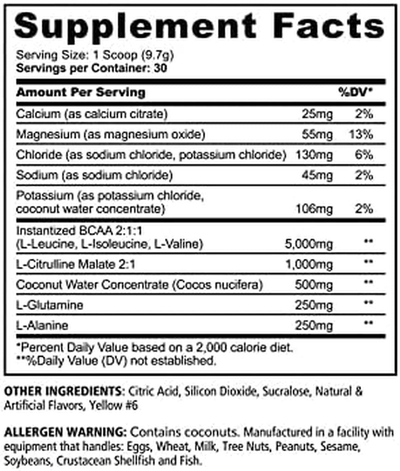 With 5G of BCAA’s, your muscle recovery should be supported before and after your exercise session.Take your workout and performance to the next level. Don’t let your exercise get the best of you. Make sure you protect that muscle you work so hard for and be able to push longer during those training sessions. Coconut Water Powder provides an abundance of 5 electrolytes that are known to support rapid hydration.You’ve heard it said, it’s not what your body takes in, it’s what your body absorbs. This exceptional formula can be taken any time of the day. Use it before or after your workout, or even use it to mix with water and enjoy as your favorite drink. Its superior taste is unlike any other. PERFORM: 2:1:1 BCAA HYDRATE: 500MG Coconut Water Powder RECOVER: 250MG L-Glutamine ABSORB: 250MG L-Alanine 100% Stimulant Free