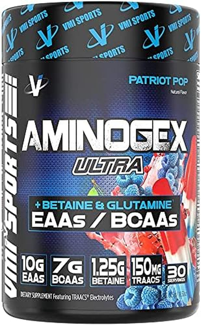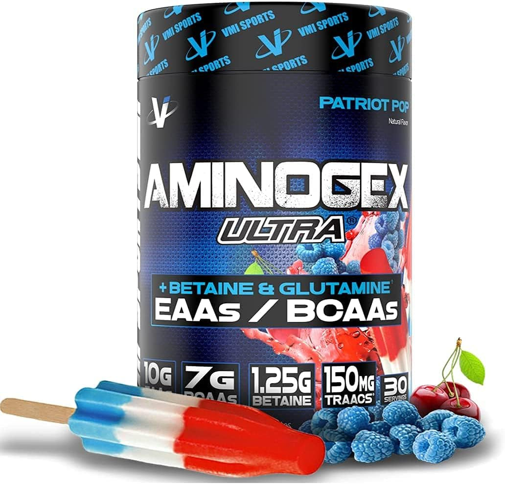 VMI Sports Aminogex Ultra | BCAA Powder | Amino Acids + Betaine and Glutamine | Amino Acid Post Workout Recovery Drink | Intra Workout Drink with Electrolytes | (30 Servings) (Patriot Pop) - Patriot Pop is backordered and will ship as soon as it is back in stock.