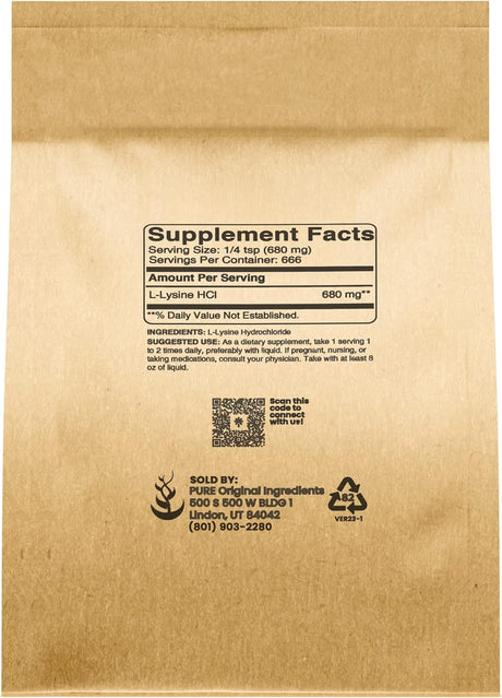 Pure Original Ingredients L-Lysine Hcl (1Lb) Alpha Amino Acid, Non-Gmo, Gluten-Free