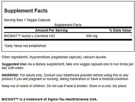 Swanson Amino Acid Acetyl L-Carnitine Hcl 500 Milligrams 120 Veg Capsules (2 Pack)