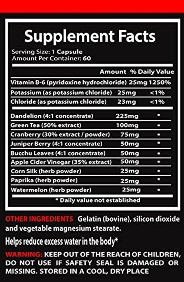 - WATER AWAY: Water Away is a natural supplement that uses ingredients that come from nature and help you control the water inside your systems. The ingredients include: Vitamin B6, Potassium, Chloride, Dandelion, Green Tea, Cranberry, Juniper Berry, Bucchu Leaves, Apple Cider Vinegar, Corn Silk, Paprika, and Watermelon.