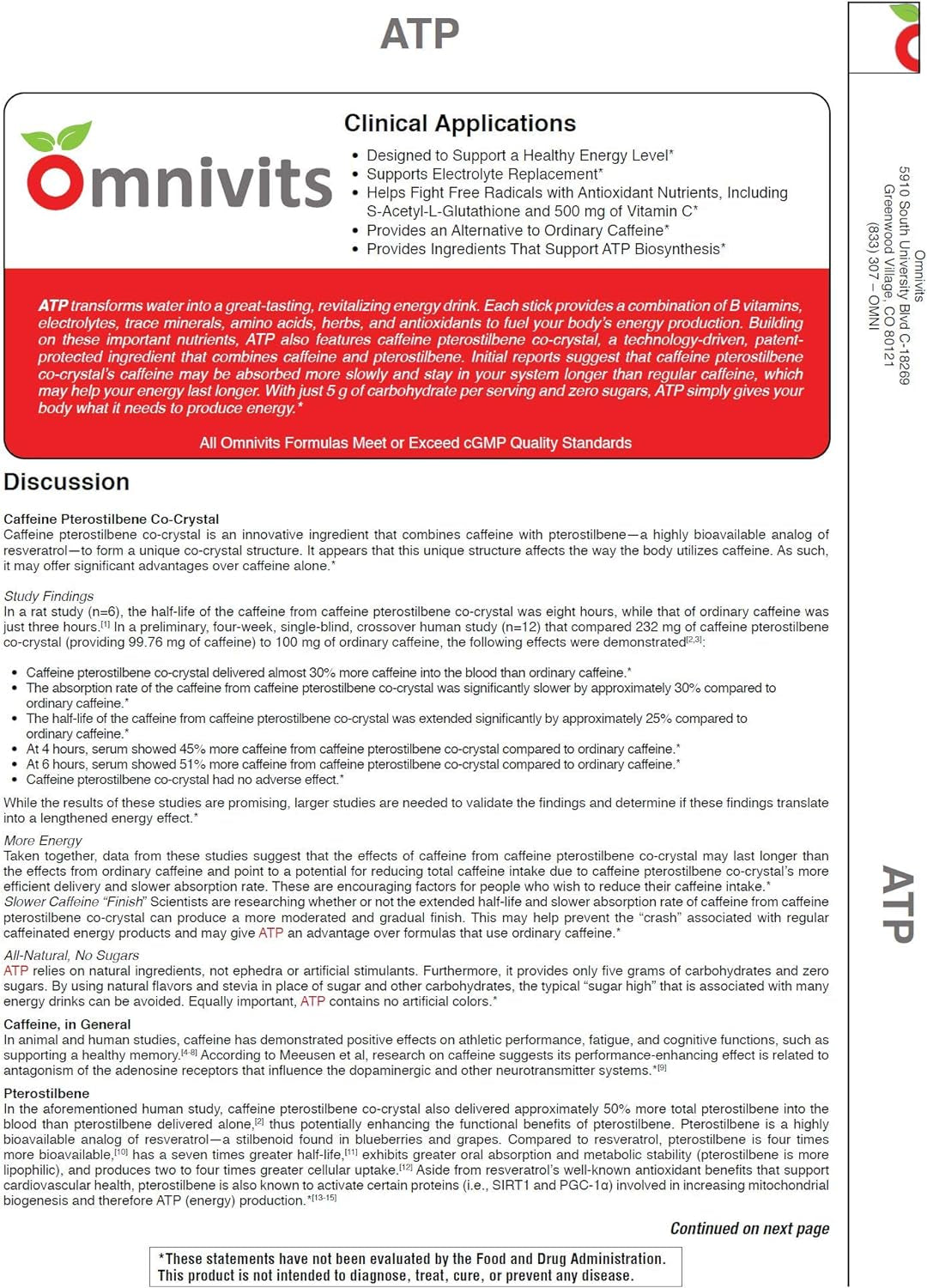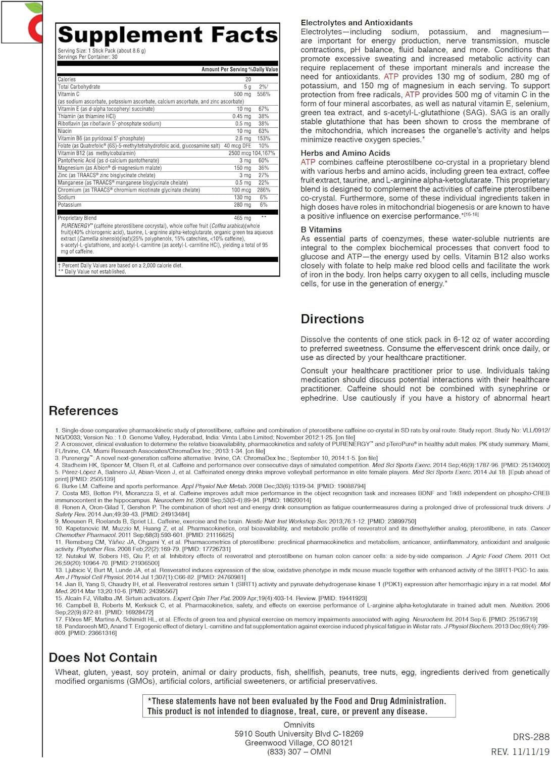 ATP transforms water into a great-tasting, revitalizing energy drink. Each stick provides a combination of B vitamins, electrolytes, trace minerals, amino acids, herbs, and antioxidants to fuel your body’s energy production. Building on these important nutrients, ATP also features Purenergy, a technology-driven, patent-protected ingredient that combines caffeine and pTeroPure pterostilbene. Initial reports suggest that Purenergy’s caffeine may be absorbed more slowly and stay in your system longer than regular caffeine, which may help your energy last longer. With just 5 g of carbohydrate per serving and zero sugars, ATP simply gives your body what it needs to produce energy.*
