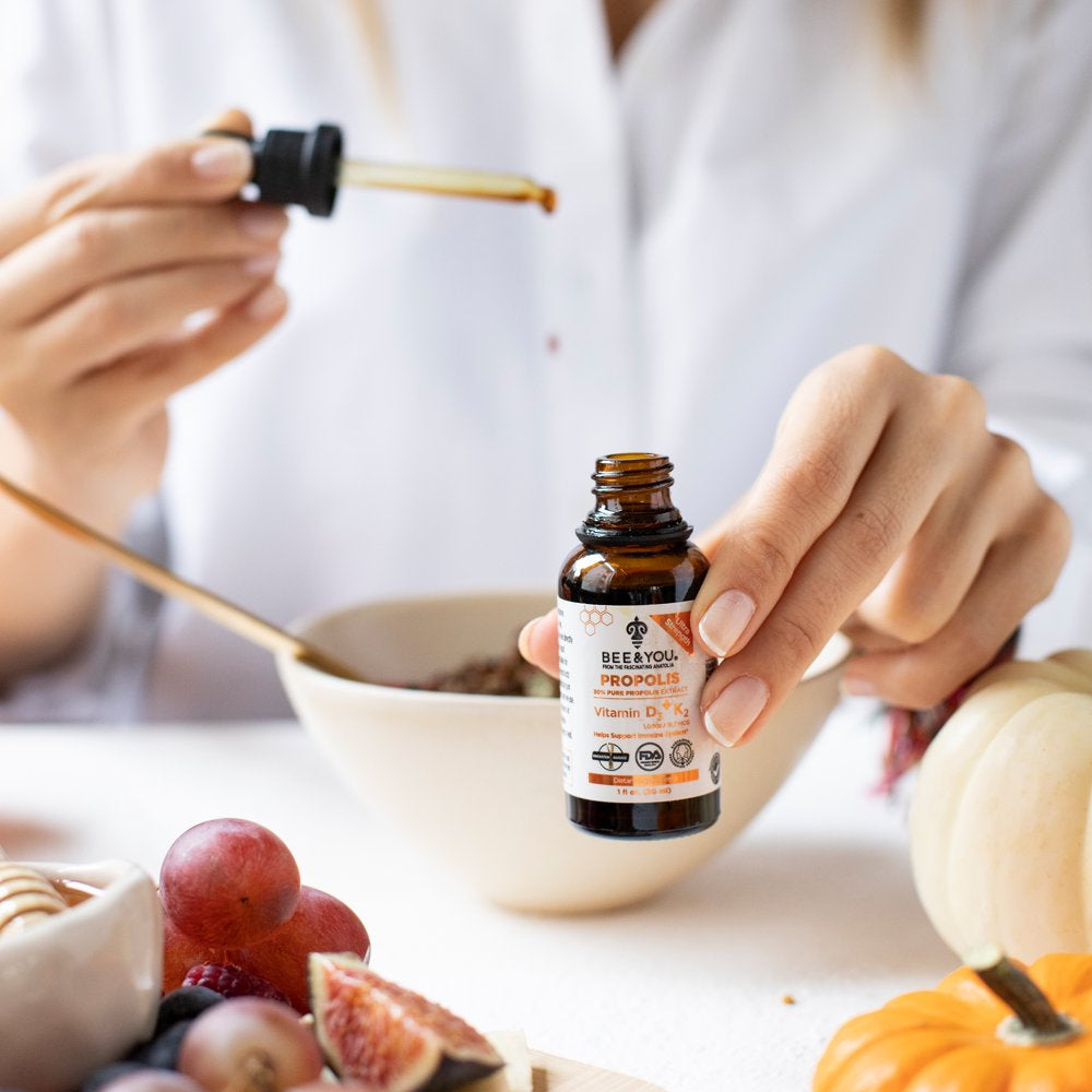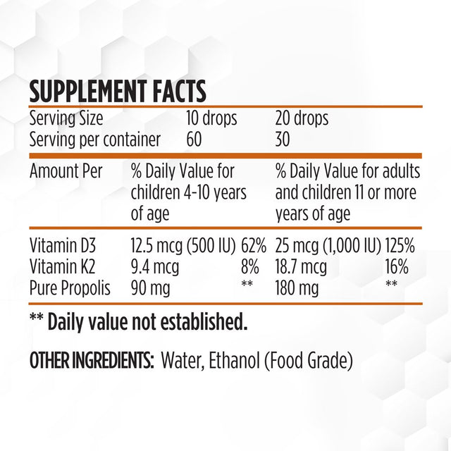 - IMMUNE SUPPORT: Rich in antioxidants, high CAPE content makes it a natural immune support especially during Cold & Flu season and has more antioxidant level than the highest grade of Manuka Honey. It has also 125% DV Vit D3 and 16% DV Vit K2 per serving (20 drops). They both provide a synergic effect in balancing your blood calcium level that regulates your blood vessels and bones' health