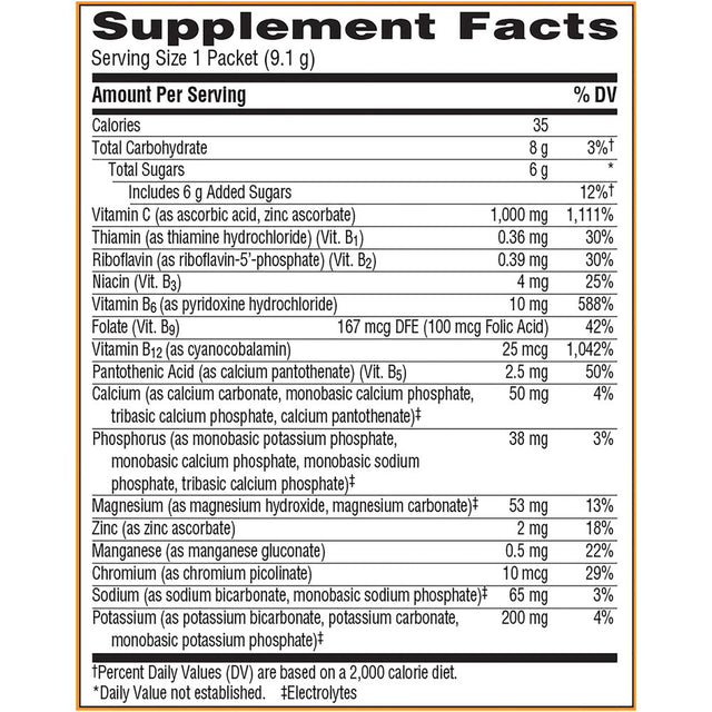 Emergen-C vitamin C drink mix is a great way to support your daily wellness routine. Emergen-C provides Daily Immune Support* with more Vitamin C than 10 oranges (1) – and is packed with B Vitamins to enhance energy* naturally, Electrolytes and Antioxidants (2). Emergen-C Vitamin C drink mixes are made with natural, real fruit flavors, plus they have no artificial sweeteners and are caffeine-free. Mix with 4 to 6 ounces of water for a fizzy, fruity boost of goodness. With dozens of tasty flavors and a variety of special formulas, Emergen-C Original Formula vitamin mix makes it deliciously easy to support ongoing wellness goals. Transform every day with immune-supporting Vitamin C from Emergen-C. (1) Based on using the USDA.gov nutrient database value for a large, raw orange (2) Antioxidants include Vitamin C, Zinc and Manganese *These statements have not been evaluated by the Food and Drug Administration. This product is not intended to diagnose, treat, cure, or prevent any disease.