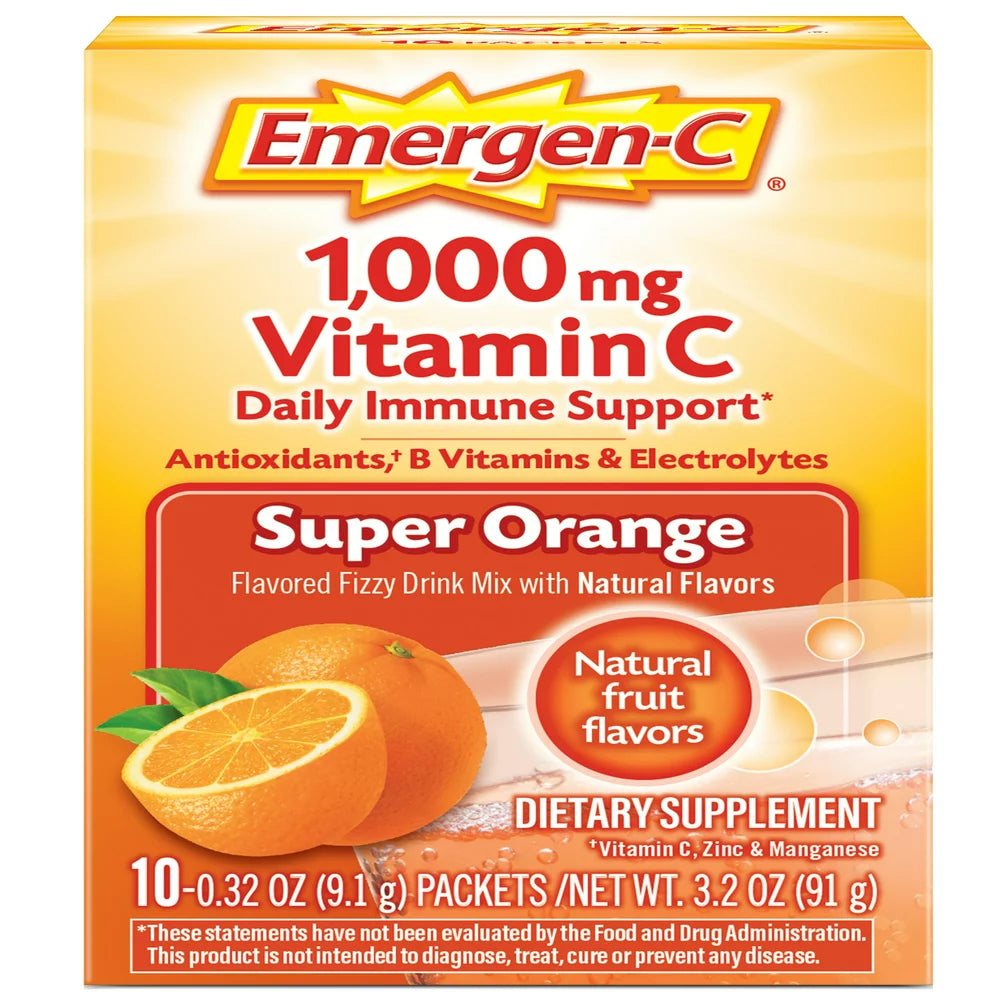 Emergen-C 1000Mg Vitamin C Powder, with Antioxidants, B Vitamins and Electrolytes for Immune Support, Caffeine Free Vitamin C Supplement Fizzy Drink Mix, Super Orange Flavor - 10 Count