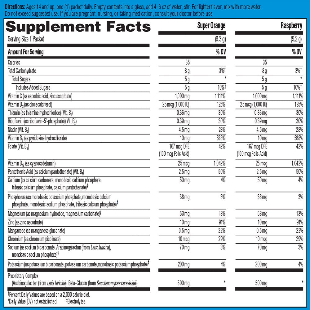 Active Ingredients: Super Orange Ingredients: Fructose, Citric Acid, Maltodextrin, Malic Acid. Contains <2% of: Acacia, Beta-Carotene (Color), Dried Orange Juice Concentrate (Color and Flavor), Glycine, L-Aspartic Acid, Natural Flavors, Orange Oil, Rebaudioside A (Extracted and Purified from Natural Stevia Leaf), Silicone Dioxide, Sugar, Tartaric Acid, Tocopherols (to Preserve Freshness).Raspberry Ingredients: Fructose, Dried Cane Sugar, Maltodextrin, Citric Acid. Contains <2% of: Acacia, Caramel Color, Dried Fruit & Vegetable Juice Concentrates (Beet, Blackberry, Raspberry, Cherry) (Color and Flavor), Glycine, L-Aspartic Acid, Malic Acid, Natural Flavors, Rebaudioside A (Extracted and Purified from Natural Stevia Leaf), Silicon Dioxide, Sugar, Tartaric Acid, Tocopherols (to Preserve Freshness)./div>