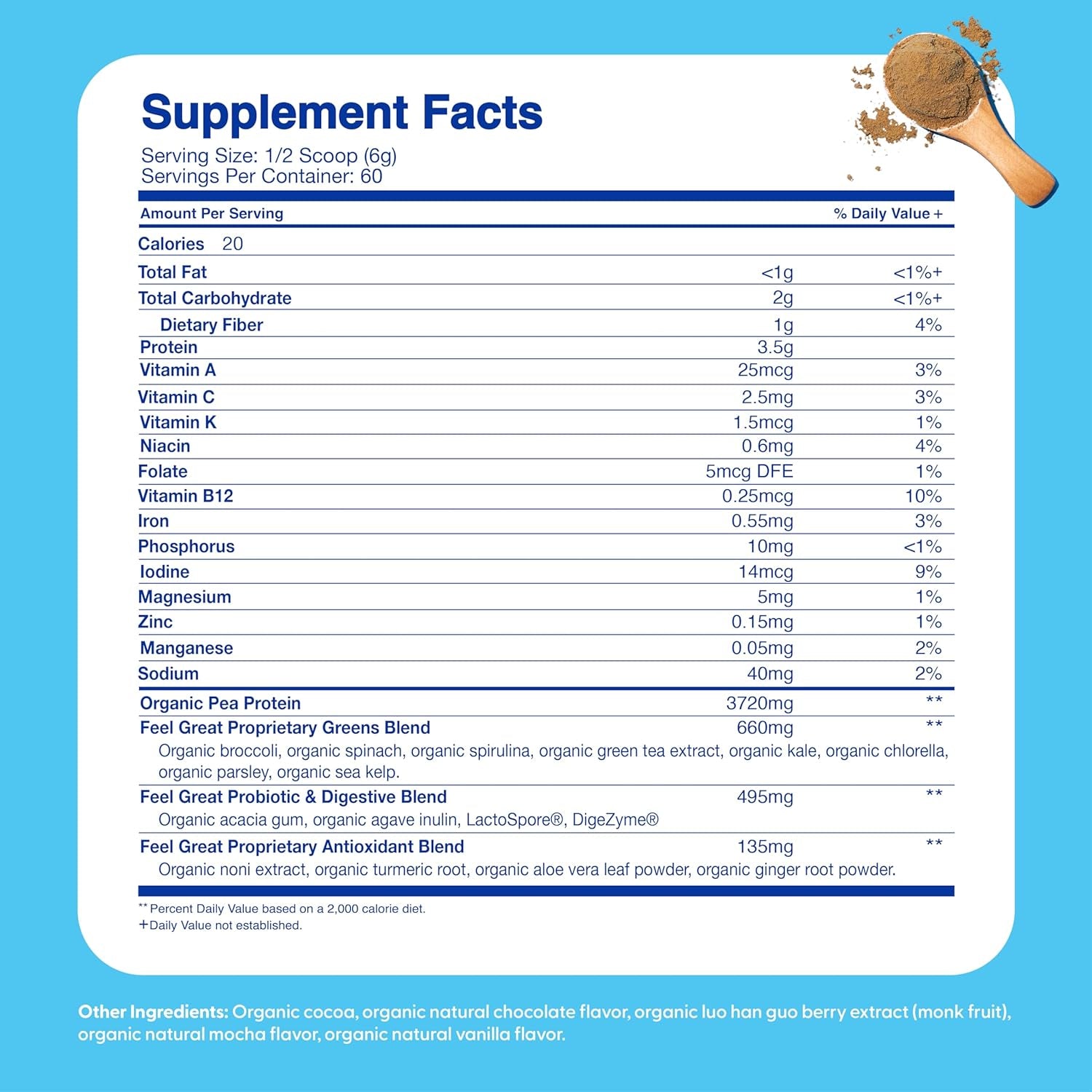 Feel Great USDA Organic Kids Protein Shake | Kids Protein Powder with Greens, Vitamins, Probiotics & Antioxidants | Vegan Chocolate Kids Nutritional Shake & Smoothie Mix | 60 Servings - Kids Protein Powder is backordered and will ship as soon as it is back in stock.