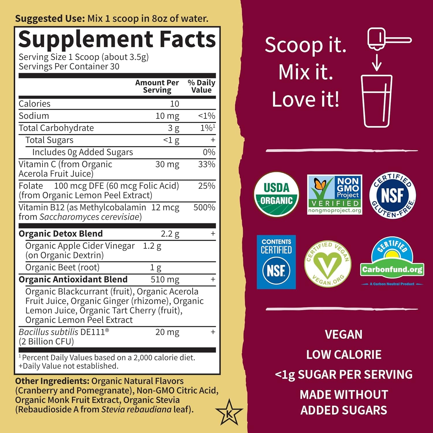 Start your day (or the day after) with our delicious BEETS Detox! Garden of Life BEETS Detox was specifically formulated with key ingredients that support the body’s natural detoxification systems†. Help build healthy blood cells, promote elimination and healthy digestion, flush out liver toxins and make your diet and exercise program more effective† with 1g of Organic beetroot, 1.2g of Organic Apple Cider Vinegar from the mother, a powerful antioxidant blend of Organic Blackcurrant, Acerola, Ginger, Lemon and Tart Cherry—plus 2 Billion CFU of Clinically Studied probiotics Bacillus subtilis DE111. Mix this delicious Cranberry Pomegranate flavored powder into water, pink lattes, smoothies, protein shakes or even your favorite baked goods—all with less than 1g of sugar per scoop. BEETS Detox is proudly Third-Party Certified USDA Organic, Non-GMO, Vegan, NSF Gluten Free and Contents Certified, as well as Kosher and Certified Carbonfree. †These statements have not been evaluated by the Food and Drug Administration. This product is not intended to diagnose, treat, cure or prevent any disease.