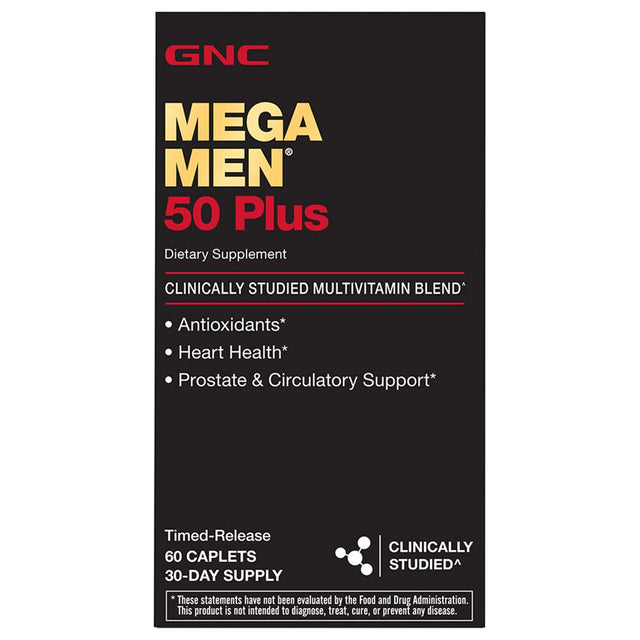 GNC Mega Men 50 Plus: A Clinically Studied Multivitamin^ More antioxidant power than ever and over 30 clinically studied ingredients in every formula - all in smaller, easier-to-swallow pills. Men's Health - Contains a clincally studied men's multivitamin shown to work better than a basic multivitamin. Helps support colon health. Antioxidants - Packed with antioxidants to help protect against harmful free radicals that can destroy healthy cells and promote cell aging. Heart Health - Includes vitamin B-6 and folic acid, which provide dietary support for your cardiovascular system. Prostate & Circulatory Support - Features lycopene and saw palmetto to support prostate function, and L-arginine, which helps to maintain blood vessel tone and plays a key role in sexual health. Not all multivitamins are created equal. When it comes to something as important as your health, you want a high quality multivitamin. Not only is every GNC Mega Men and Women’s Ultra Mega multivitamin complex created with the vitamins and minerals you need to live well, they’re also clinically proven to make you feel better.† Here’s four more reasons to choose GNC Mega Men and Women’s Ultra Mega multivitamins. ^In a randomized, double-blind, placebo-controlled study of 112 healthy volunteers, subjects taking the GNC vitamin and mineral blends for six weeks experienced significant improvements in serum levels of certain key nutrients compared to a placebo and a leading multivitamin formula based upon multivariate statistical analyses of a group of B vitamins (thiamin, niacin, riboflavin, pantothenic acid, biotin, folic acid and vitamins B-6 and B-12) and key antioxidants and carotenoids (a group of beta-carotene alpha-tocopherol, selenium, lutein and lycopene). Statistical improvements in SF-36 Vitality and Mental Health scores were also observed compared to placebo.