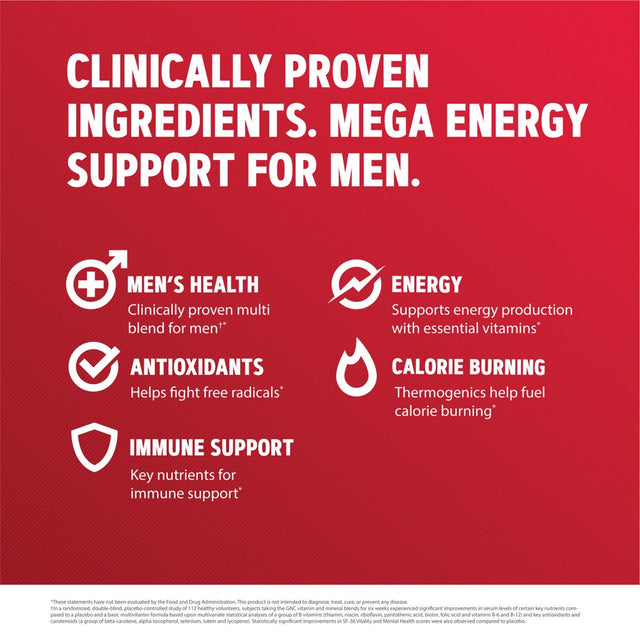 - PACKED WITH KEY NUTRIENTS: GNC Mega Men Energy & Metabolism Multivitamin contain ingredients that help support prostate health, vitamins essential for energy production, thermogenic ingredients to support calorie-burning, and antioxidants, which help fight free radicals that can be produced during intense exercise.