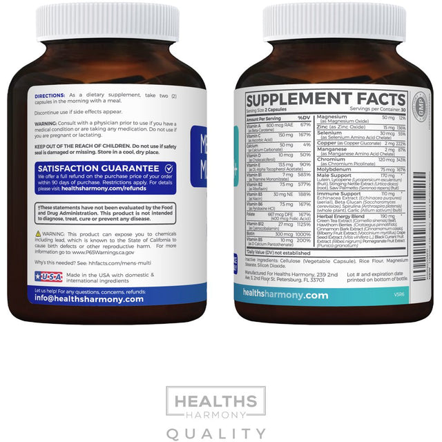 Are you overwhelmed every time you open your medicine cabinet? Have you been wishing someone would make a supplement that already includes everything you need to look and feel your best each day - in just one serving? Men’s Multivitamin Plus from Healths Harmony! Support your prostate health, aid your immune system, optimize your vision, boost your energy, and fortify your body and mind with a bevy of vitamins and minerals – all with just two vegetable capsules per day! Each bottle contains 60 Capsules giving you a full months supply!