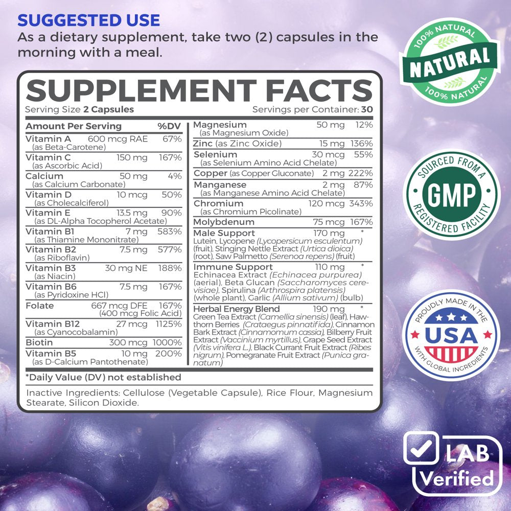 • STOCK UP: We’ve included a full suite of vitamins: A, C, D, E, B1, B2, D3, B6, B12 and BE; an arrange of essential minerals: Biotin, Calcium, Magnesium, Zinc, Selenium, Copper, Manganese, Chromium, and Molybdenum; and herbal blends including Saw Palmetto designed to aid your immune system, reduce inflammation, support your vision, optimize prostate health and give you an energy boost. Each bottle contains 60 Capsules giving you a full months supply!
