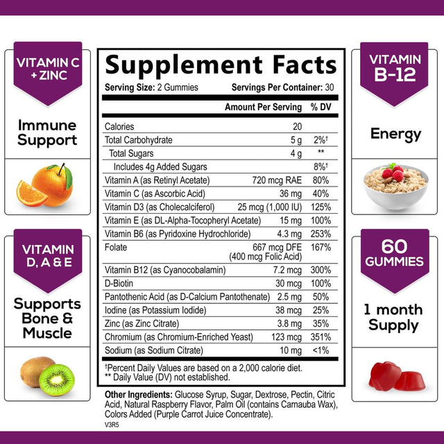 Multivitamin Gummies, Extra Strength Daily Multi Vitamin Gummy for Women & Men with Vitamins A, C, D, E, B6, B12, Zinc & Antioxidants Supplement for Immune Health Support, Non-Gmo, Berry - 60 Gummies