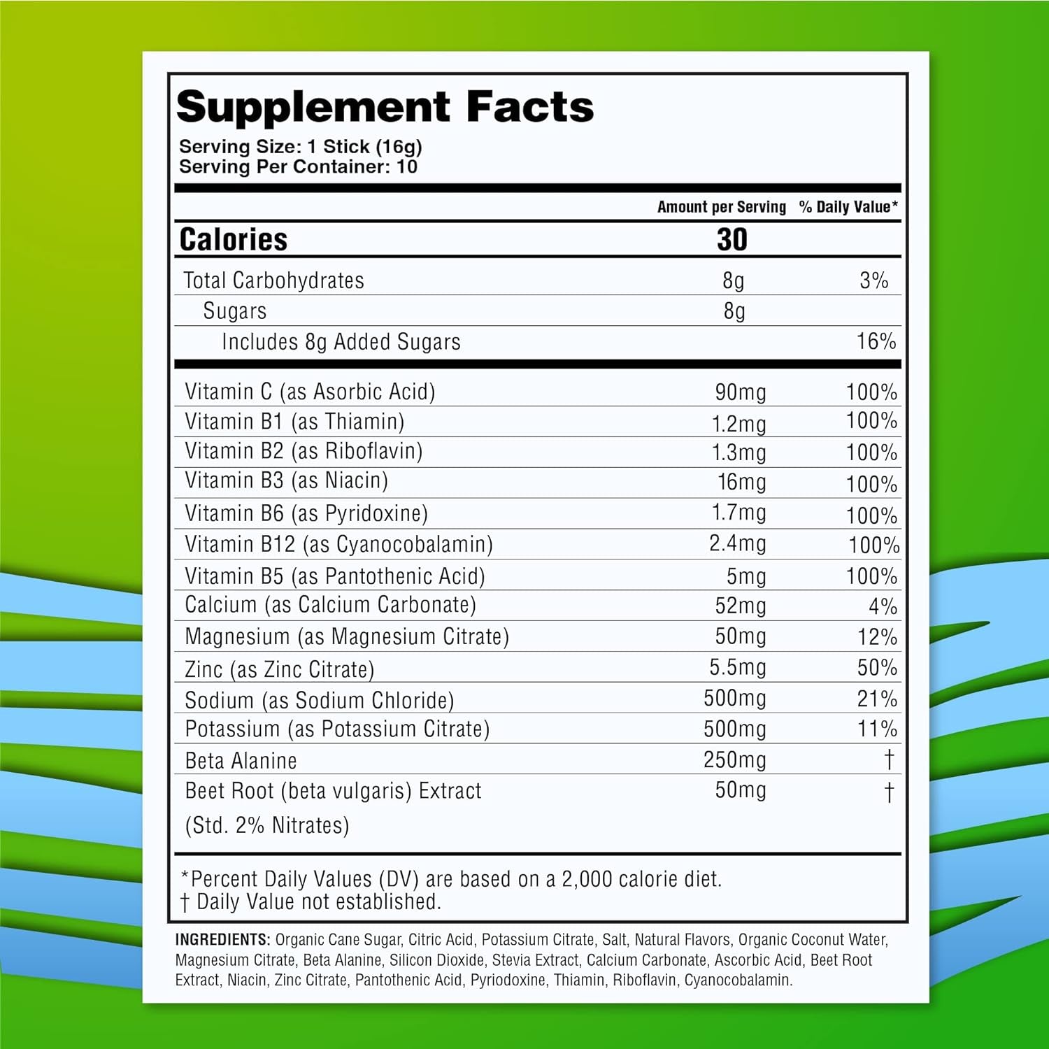 - ✅ HYDRATE, FOCUS, & ENERGIZE: This revolutionary powder stick delivers hydration to the bloodstream faster and more efficiently than water alone. It also contains beta-alanine, an amino acid that enhances cognitive performance, suppresses fatigue, and promotes recovery.