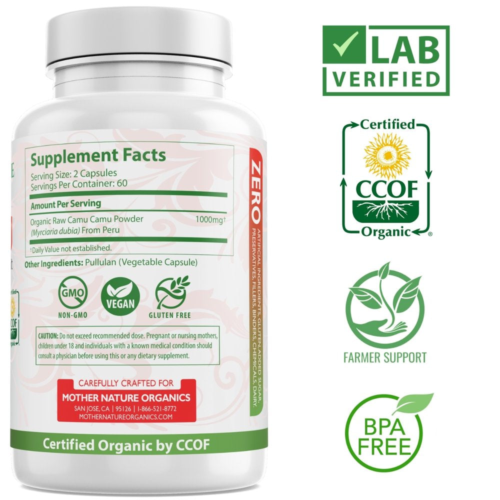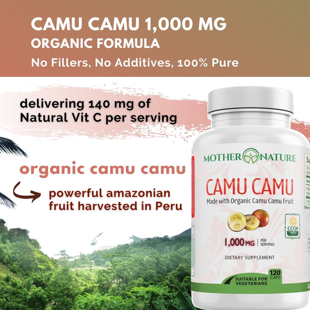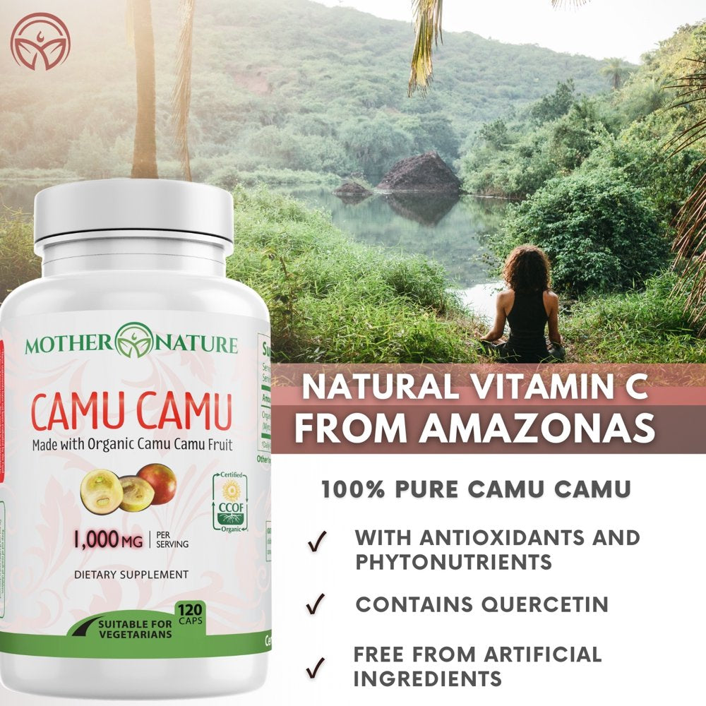 • MADE WITH 100% PURE ORGANIC CAMU CAMU: Mother Nature Organics Camu Camu Berry capsules help promote healthy blood circulation and promotes healthier skin and encourages cell regeneration. Well absorbed and gentle on the stomach, Mother Nature Organics Camu Camu may also support a healthy mood, mood balancing, healthy mental outlook, healthy cardiovascular & circulatory system, healthy brain function, increasing mental focus, & cognitive performance and reduction of tiredness and fatigue.