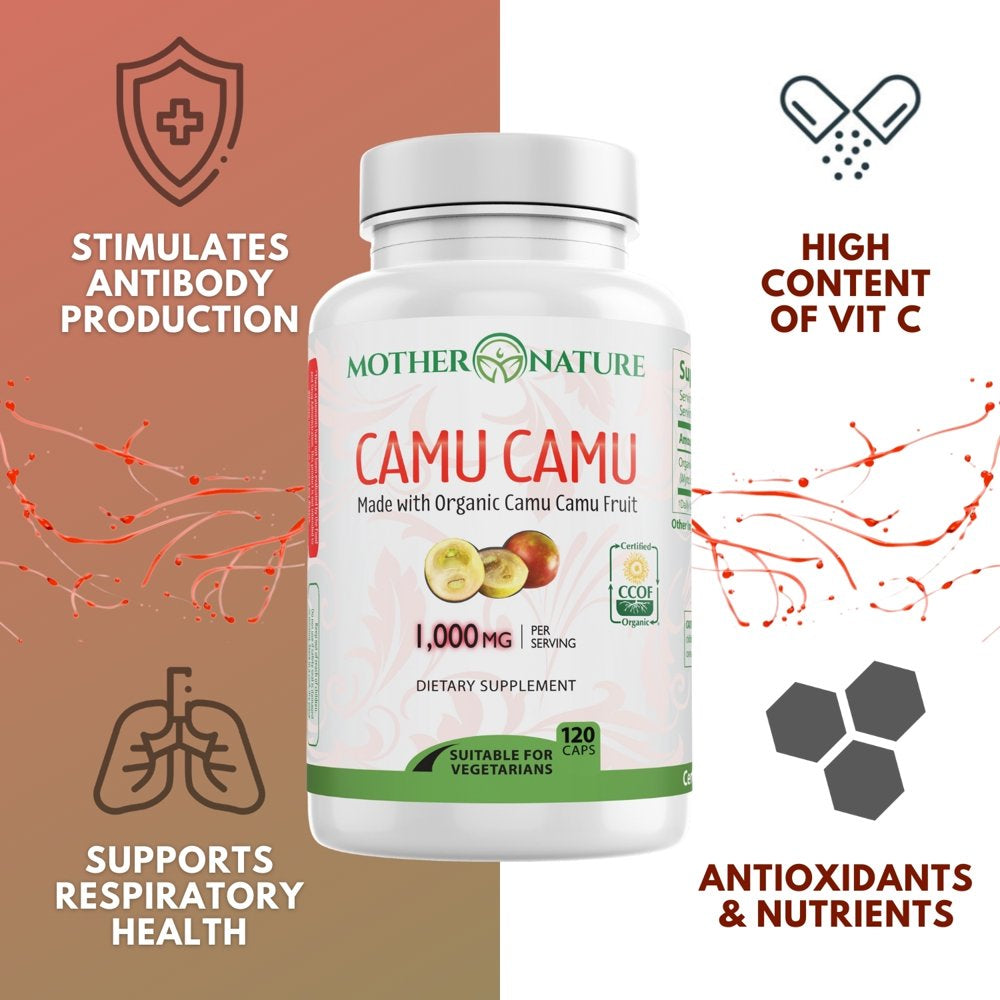 • DAILY IMMUNE BOOST: Natural Vitamin C from Camu Camu stimulates antibody production to aid the immune system in reducing the severity and duration of colds. Mother Nature Organics Camu Camu capsules from Peru is needed for the production of collagen, which prevents wrinkles on your face and reduces the signs of aging. Use for baked treats, such as cookies, or mix with oatmeal or into your breakfast smoothie for a vitamin C boost! This comes with 120 capsules.