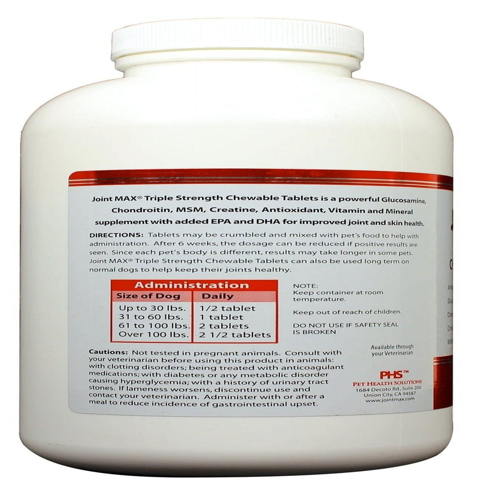 Joint MAX Triple Strength (TS) Chewable Tablets for Dogs help enhance the functions of joint and connective tissues with powerful active ingredients. Our proprietary blend targets lubrication, cushioning of tissues, and support of cartilage, connective tissues, and bones. Active ingredients include Glucosamine, Chondroitin, MSM, Hyaluronic Acid, and Zinc. Antioxidants are added to help remove damaging free radicals and allowing the body's cells to flush them out. It also contains omega fatty acids EPA & DHA, which are essential in any diet and help keep muscles and joints strong. This formula is recommended for older or middle aged dogs with maximum joint support needs. Our Joint MAX supplements come in formulas for dogs, cats, and horses and in various administration methods, making It easy to find the right supplement to meet your pet's joint support needs! Joint MAX is safe to use alongside prescription drugs.