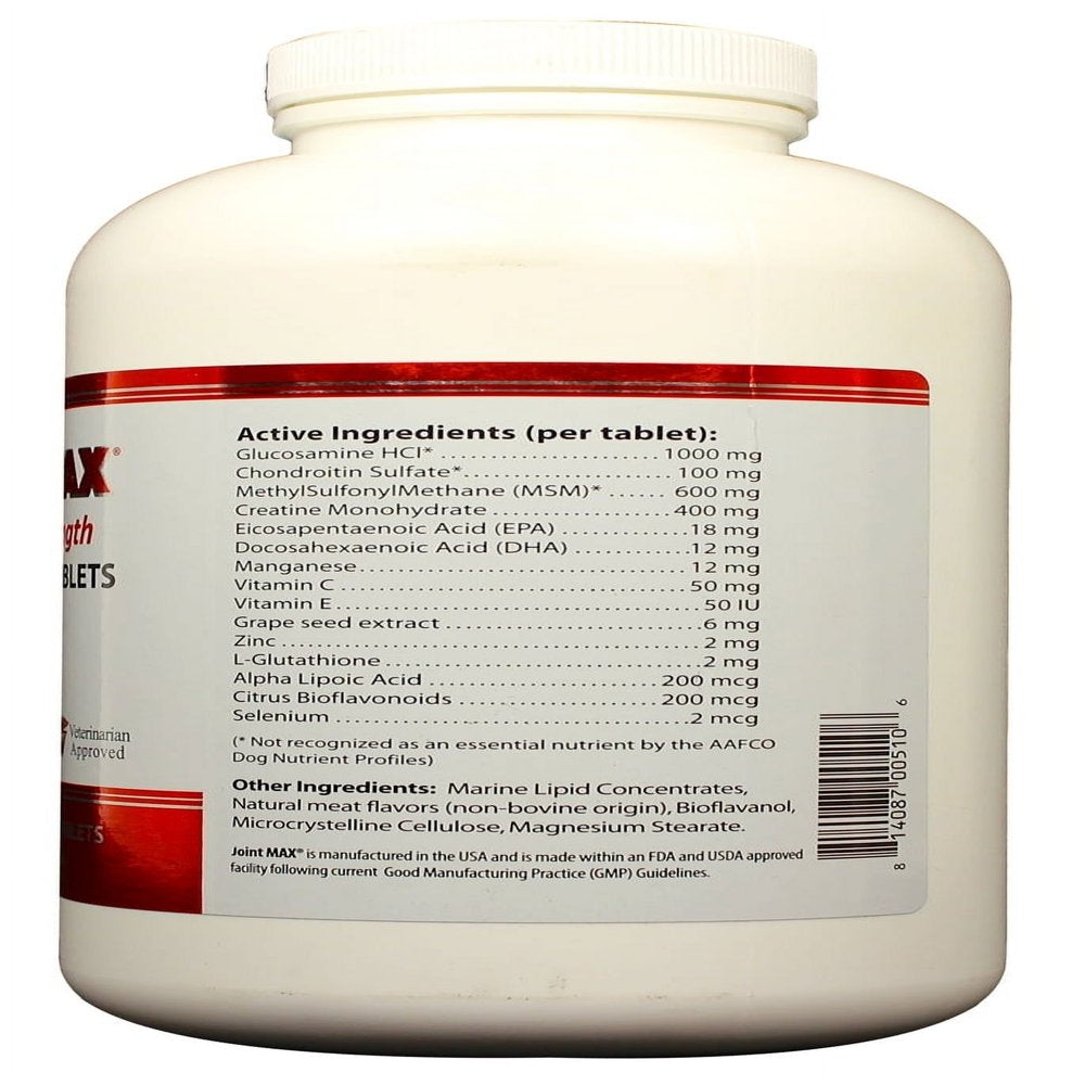 [OUR PROPRIETARY BLEND OF INGREDIENTS WAS SELECTED TO TARGET EVERY ASPECT OF JOINT HEALTH] Lubrication, cushioning of tissues, and support of cartilage, connective tissues, and bones. Our formula also contains antioxidants to help reduce oxidative stress. This powerful joint supplement is intended for older or middle-aged large dogs or smaller dogs with maximum joint support needs.,[ACTIVE INGREDIENTS INCLUDE GLUCOSAMINE, CHONDROITIN, EPA & DHA] Glucosamine and Chondroitin help keep joints and connective tissues resilient, lubricated, and mobile. Chondroitin is necessary for healthy cartilage as it absorbs water to keep the cartilage hydrated and cushioned. Omega-3 fatty acids, like EPA & DHA help ease joint stiffness by cushioning tissues. All these ingredients work together to help keep your dog active longer with less mobility issues.,[ANTI-INFLAMMATORY AGENTS & ANTIOXIDANTS] Joint MAX contains MSM, an organic form of sulfur. Healthy connective tissues and cartilage contain proteins with flexible sulfur bonds. Once the sulfur combines with glucosamine and chondroitin, they form collagen, a substance that gives cartilage its structure and flexibility. Antioxidants also play a significant role in the overall health of your dog and their joints. Vitamin C helps repair and construct cartilage to keep your pet mobile and happy.,[QUALITY PRODUCT WITH QUALITY INGREDIENTS] Our products meet all the quality and safety standards set by the National Animal Supplement Council (NASC). The NASC Quality Seal is obtained by companies whose products commit to promoting the well-being of beloved pets. Products with this seal undergo a strict inspection and are determined to have consistent quality control and accurate labels.,[JOINT MAX CARRIES A 100% PRODUCT ] Try our product without worry! Joint MAX can be used with prescription drugs and you may return the product for a full refund if you are not satisfied for any reason.