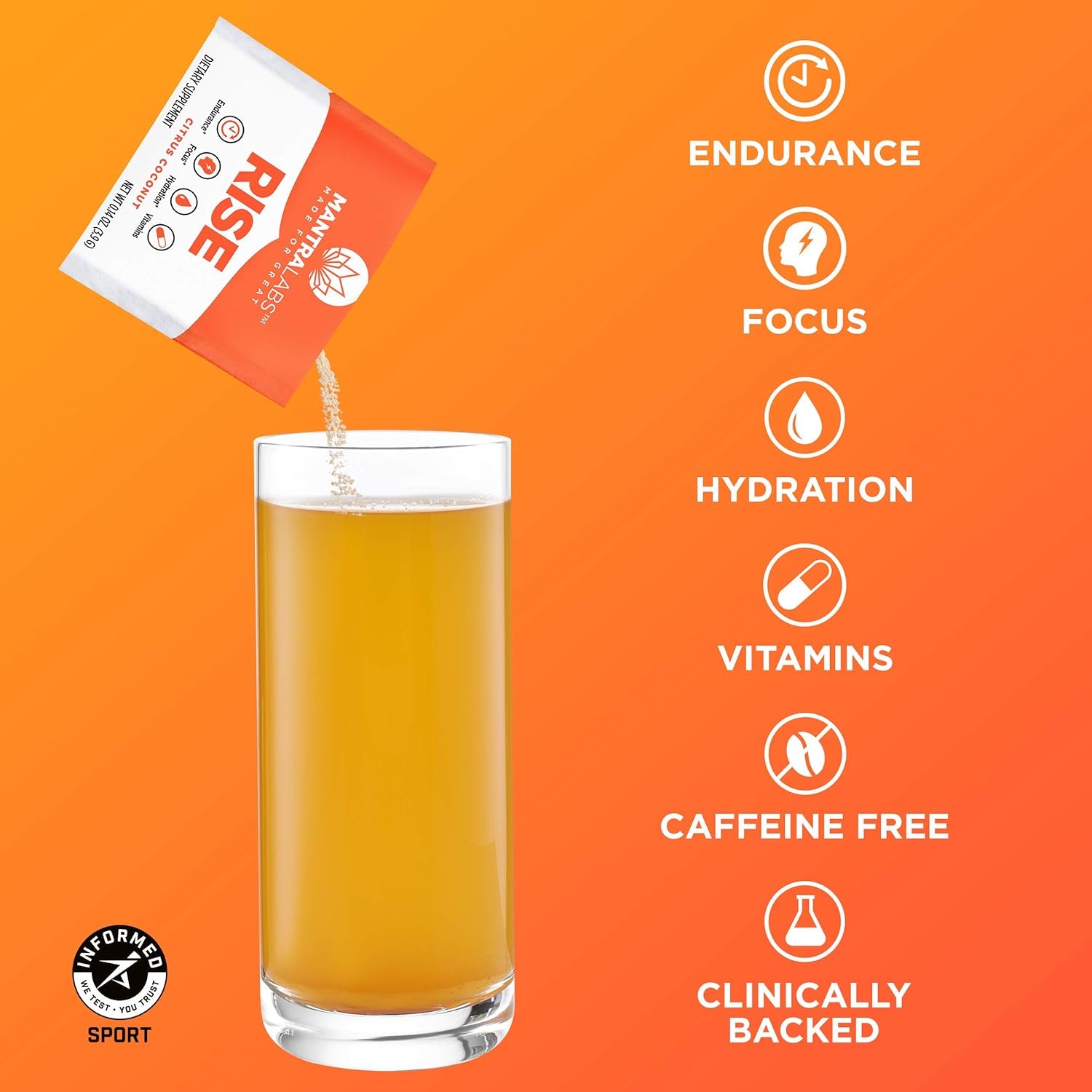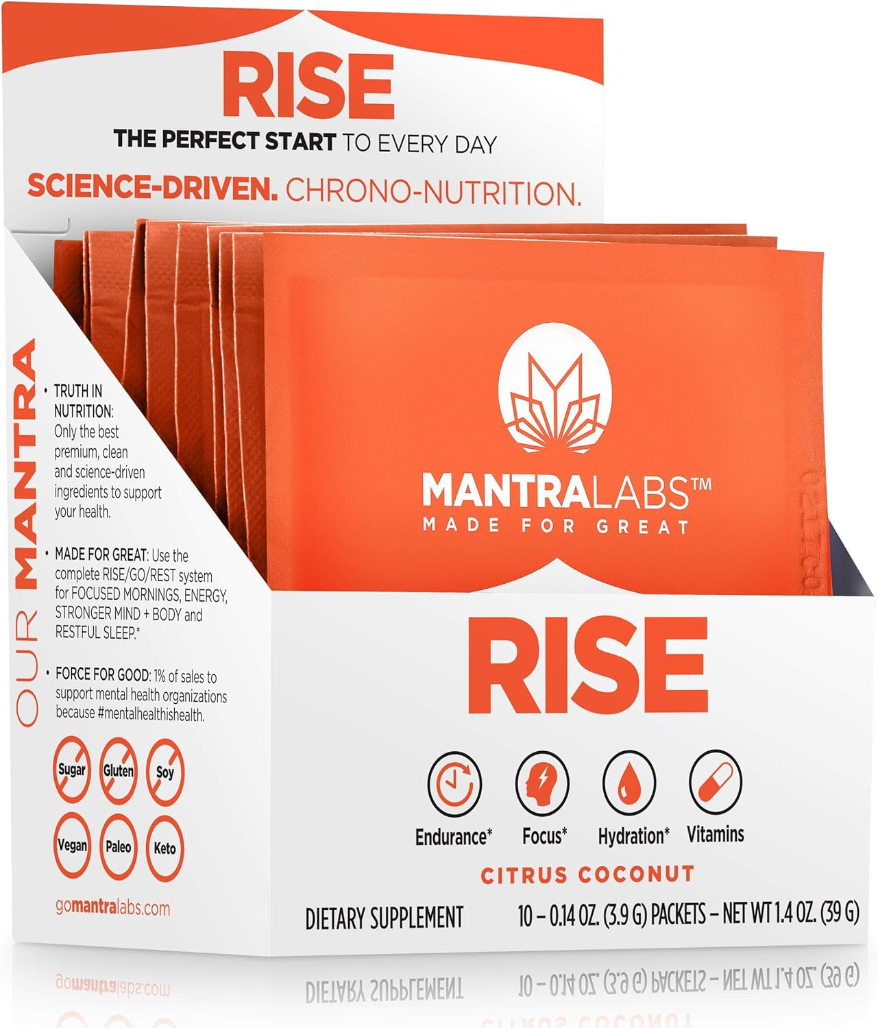 RISE Hydration Drink | Keto Friendly Nootropic Hydration Powder Packets with Vitamins & Antioxidants. Focus, Energy, 0 Caffeine | Paleo Diet Friendly | Citrus Coconut 10 Pack by MANTRA Labs