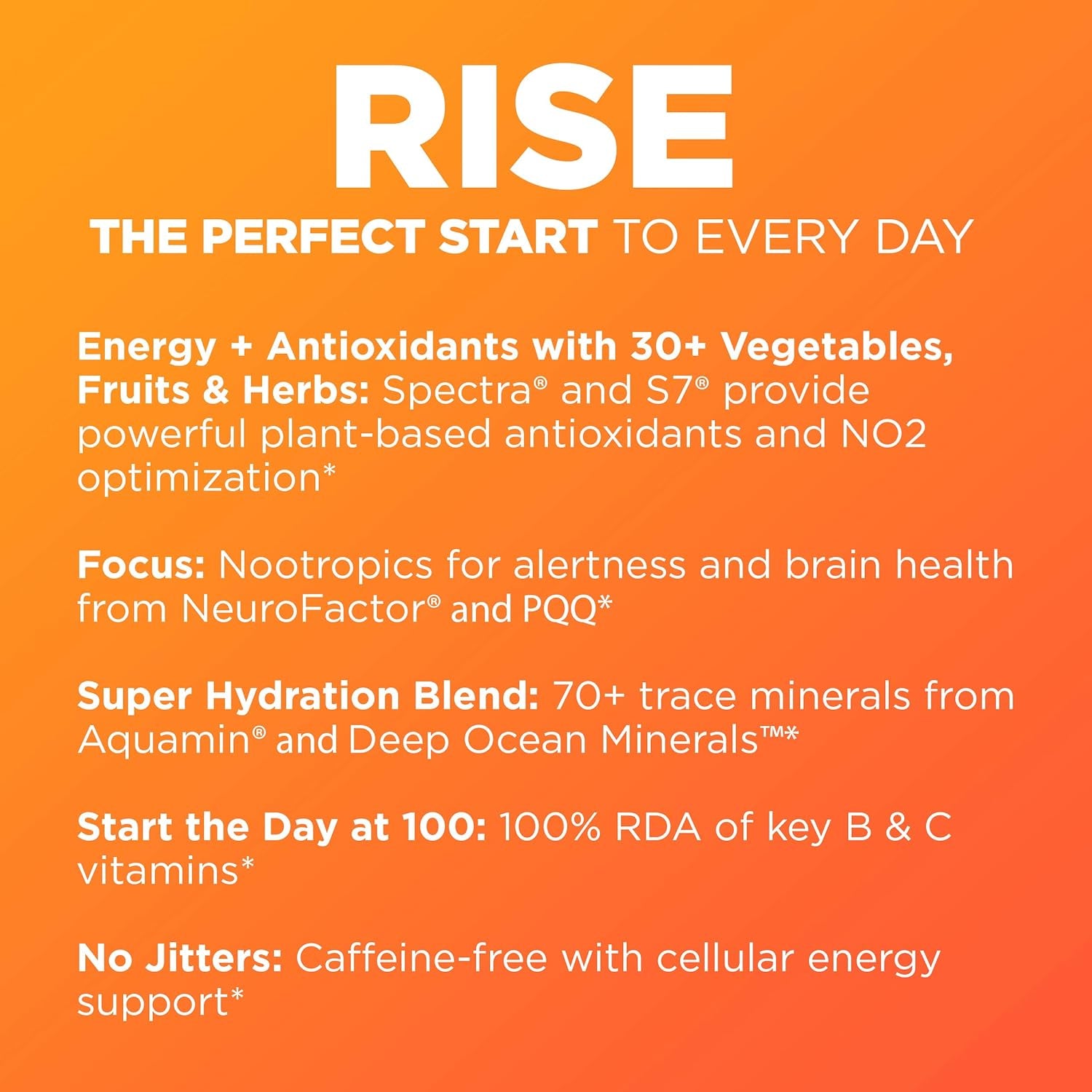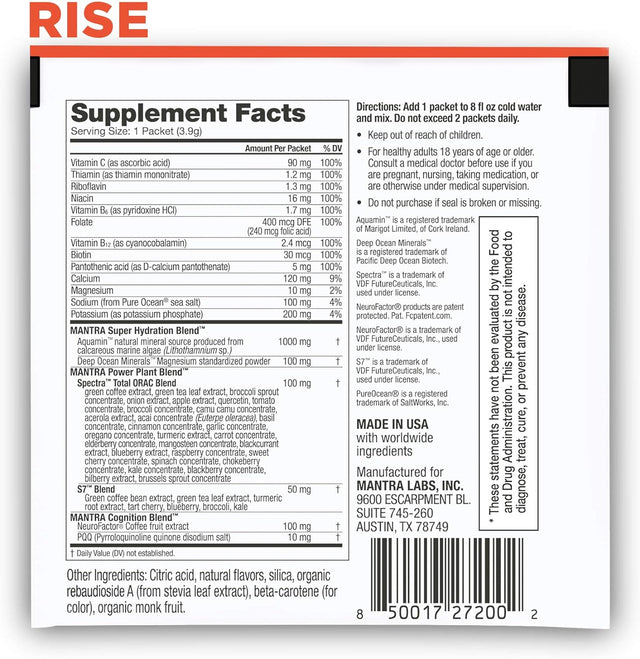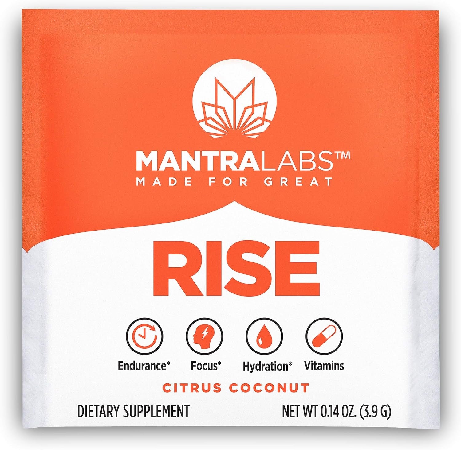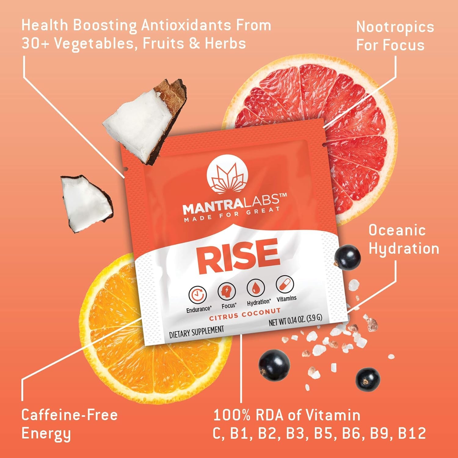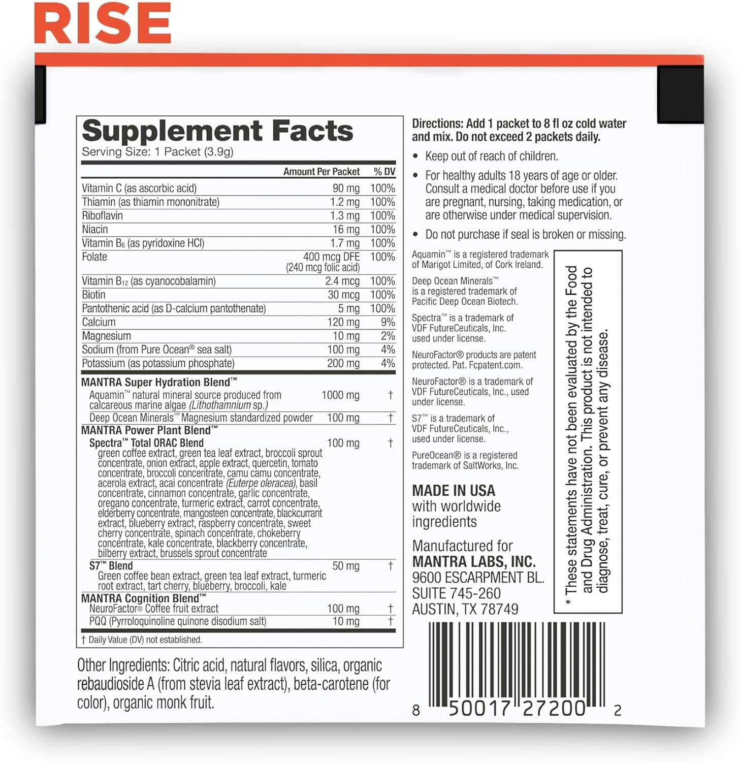 • RISE Hydration Powder Blend; Mantra Labs Rise hydration powdered drink mix contains nootropics, oceanic electrolyte hydration, 2.5 mg caffeine, antioxidants and 100% RDA of key vitamins for women and men to help you helps you get up, get focused and power up to perform better and feel fully alive.