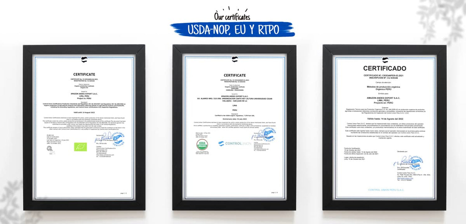 • ✔ CERTIFIED PRODUCTS.- USDA NOP and EU organic certified by Control union. We constantly to adapt our products to be consumed worldwide. Therefore, we challenge ourselves and manage to obtain new certifications.