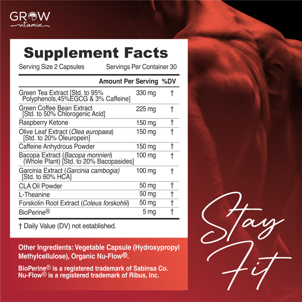 • 11 Active Ingredients: 11 Modes of Action to help burn fat, boost metabolism, and curb appetite to help you achieve results around the clock without stimulants; Grow Vitamin’s 100% transparent formula of 11 powerful ingredients including Green Coffee, Green Tea, Raspberry Ketone, CLA, L-Theanine, and Garcinia Cambogia offer unique modes of actions to help burn fat and control your appetite morning and night.