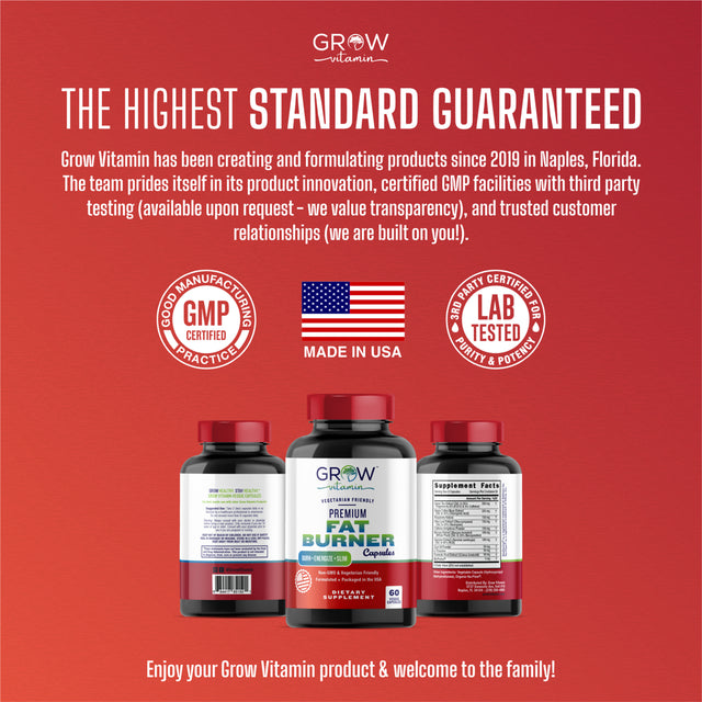 Each bottle of Grow Vitamin's Premium Fat Burner is manufactured in a cGMP manufacturing facility in the USA, adhering to the most stringent manufacturing standards.