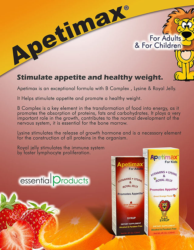 ELP ESSENTIAL Apetimax Vitamins Lysine Royal Jelly Promotes Appetite Syrup for Adults and Kids (4Oz for Kids) - 4 Fl Oz (Pack Of 1) is backordered and will ship as soon as it is back in stock.